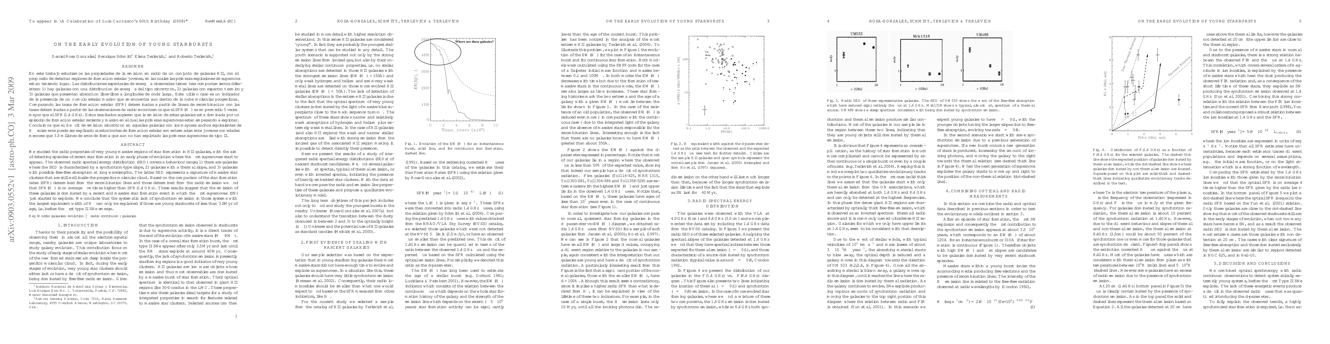 We studied the radio properties of very young massive regions of star formation in HII galaxies, with the aim of detecting episodes of recent star formation in an early phase of evolution where the first supernovae start to appear. The observed radio spectral energy distribution (SED) covers a behaviour range; 1) there are galaxies where the SED is characterized by a synchrotron-type slope, 2) galaxies with a thermal slope, and 3) galaxies with possible free-free absorption at long wavelengths. The latter SED represents a signature of massive star clusters that are still well inside the progenitor molecular cloud. Based on the comparison of the star formation rates (SFR) determined from the recombination lines and those determined from the radio emission we find that SFR(Ha) is on average five times higher than SFR(1.4 GHz). These results suggest that the emission of these galaxies is dominated by a recent and massive star formation event in which the first supernovae (SN) just started to explode. We conclude that the systematic lack of synchrotron emission in those systems with the largest equivalent width of Hb can only be explained if those are young starbursts of less than 3.5Myr of age, i.e. before the first type II SNe emerge.