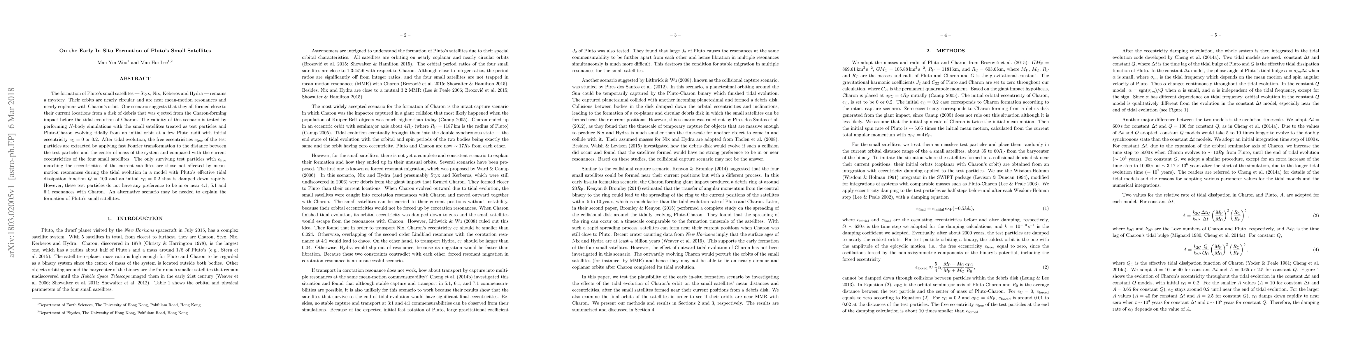 The study investigates the formation of Pluto's small satellites via simulations, finding that the 'disk of debris' scenario struggles to explain their current nearly circular and resonant orbits. Only a specific tidal evolution model with rapid dissipation aligns with their eccentricities but lacks resonance preference, suggesting an alternative formation scenario may be required.