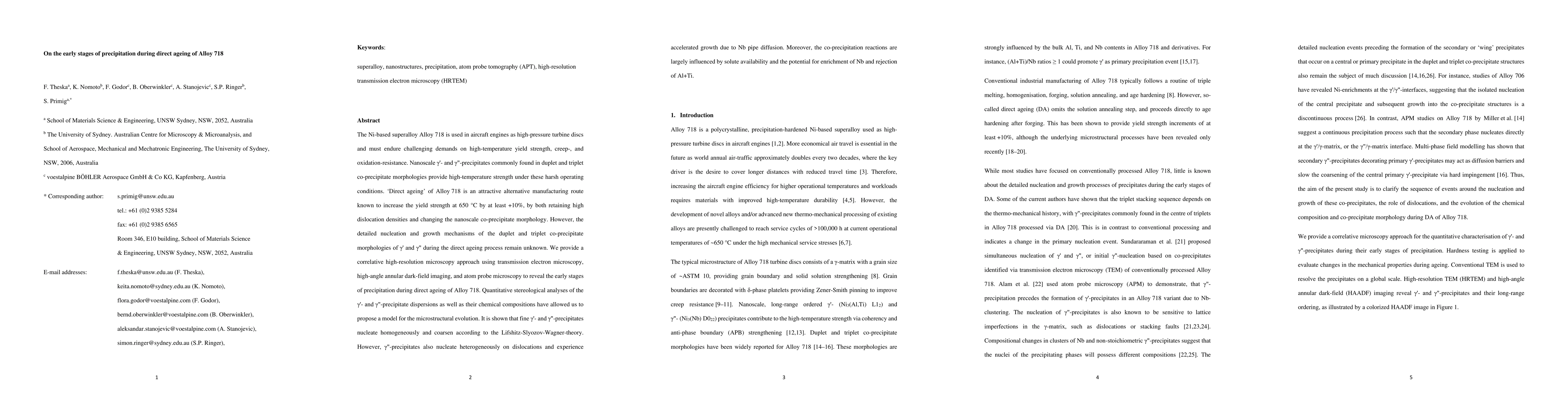 The Ni-based superalloy Alloy 718 is used in aircraft engines as high-pressure turbine discs and must endure challenging demands on high-temperature yield strength, creep-, and oxidation-resistance. Nanoscale $\gamma^{\prime}$- and $\gamma^{\prime \prime}$-precipitates commonly found in duplet and triplet co-precipitate morphologies provide high-temperature strength under these harsh operating conditions. Direct ageing of Alloy 718 is an attractive alternative manufacturing route known to increase the yield strength at 650 $^{\deg}$C by at least +10 $\%$, by both retaining high dislocation densities and changing the nanoscale co-precipitate morphology. However, the detailed nucleation and growth mechanisms of the duplet and triplet co-precipitate morphologies of $\gamma^{\prime}$ and $\gamma^{\prime \prime}$ during the direct ageing process remain unknown. We provide a correlative high-resolution microscopy approach using transmission electron microscopy, high-angle annular dark-field imaging, and atom probe microscopy to reveal the early stages of precipitation during direct ageing of Alloy 718. Quantitative stereological analyses of the $\gamma^{\prime}$- and $\gamma^{\prime \prime}$-precipitate dispersions as well as their chemical compositions have allowed us to propose a qualitative model of the microstructural evolution. It is shown that fine $\gamma^{\prime}$- and $\gamma^{\prime \prime}$-precipitates nucleate homogeneously and grow coherently. However, $\gamma^{\prime \prime}$-precipitates also nucleate heterogeneously on dislocations and experience accelerated growth due to Nb pipe diffusion. Moreover, the co-precipitation reactions are largely influenced by solute availability and the potential for enrichment of Nb and rejection of Al+Ti.