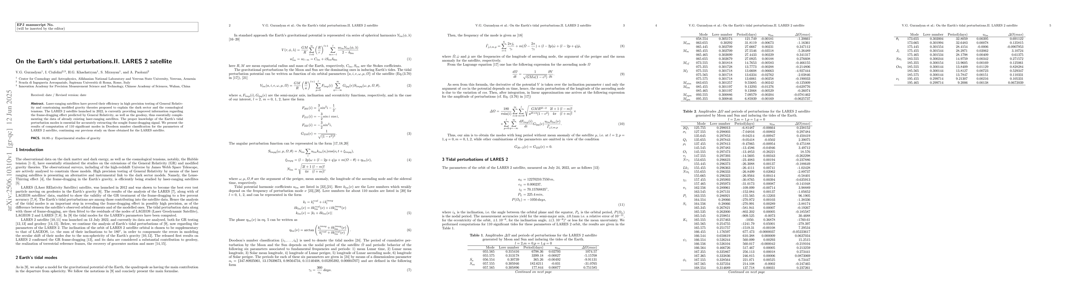 The LARES 2 satellite provides high-precision data on the Earth's tidal perturbations, helping to constrain modified gravity theories and test General Relativity, with new results for 110 significant modes.