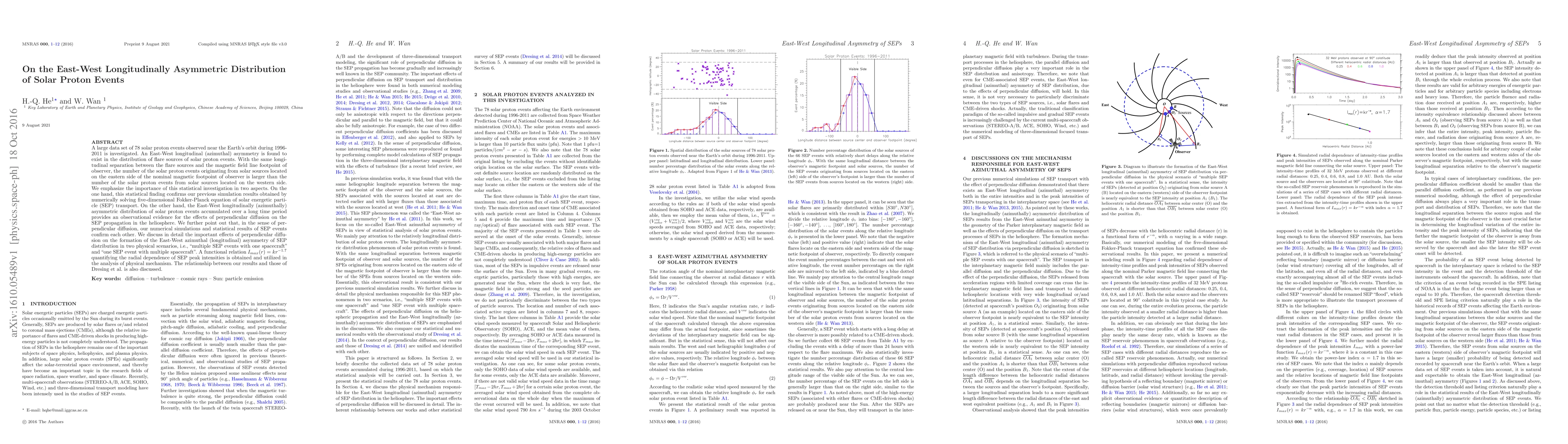 This study investigates 78 solar proton events observed from 1996-2011, revealing an East-West longitudinal asymmetry in their distribution, with more events originating from the eastern side of the observer's nominal magnetic footpoint. This finding supports previous simulation results and provides observational evidence for the effects of perpendicular diffusion on solar energetic particle propagation in the heliosphere.