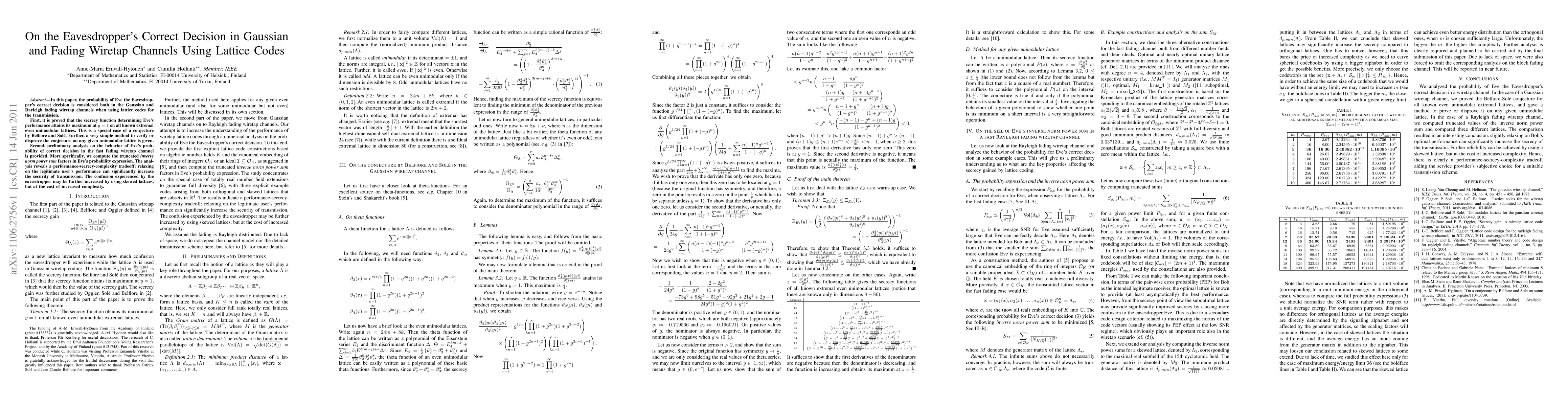 In this paper, the probability of Eve the Eavesdropper's correct decision is considered both in the Gaussian and Rayleigh fading wiretap channels when using lattice codes for the transmission. First, it is proved that the secrecy function determining Eve's performance attains its maximum at y=1 on all known extremal even unimodular lattices. This is a special case of a conjecture by Belfiore and Sol\'e. Further, a very simple method to verify or disprove the conjecture on any given unimodular lattice is given. Second, preliminary analysis on the behavior of Eve's probability of correct decision in the fast fading wiretap channel is provided. More specifically, we compute the truncated inverse norm power sum factors in Eve's probability expression. The analysis reveals a performance-secrecy-complexity tradeoff: relaxing on the legitimate user's performance can significantly increase the security of transmission. The confusion experienced by the eavesdropper may be further increased by using skewed lattices, but at the cost of increased complexity.