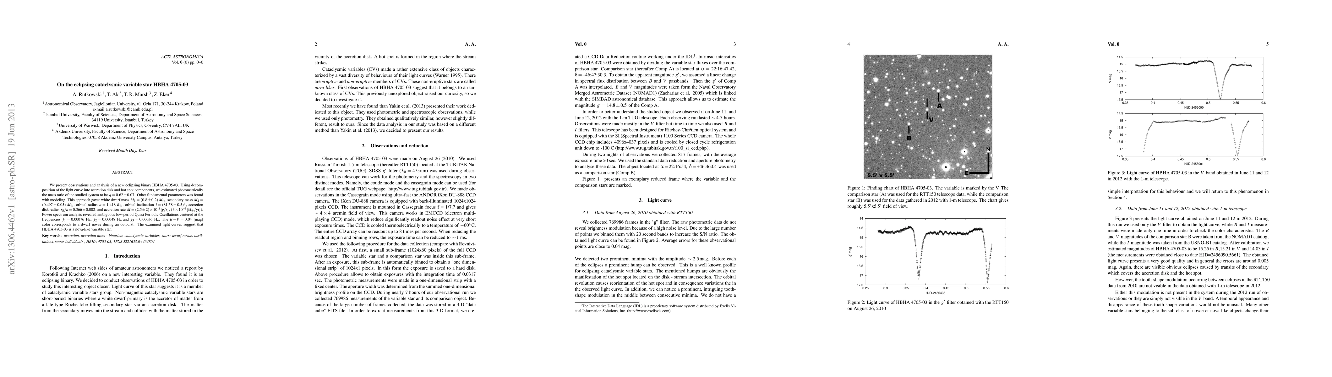 This paper analyzes the eclipsing binary HBHA 4705-03, determining its mass ratio, white dwarf and secondary star masses, and accretion disk parameters. The study finds a mass ratio of q=0.62 ± 0.07, with a white dwarf mass of (0.8 ± 0.2) M_sun and a secondary mass of (0.497 ± 0.05) M_sun, classifying it as a nova-like variable star.