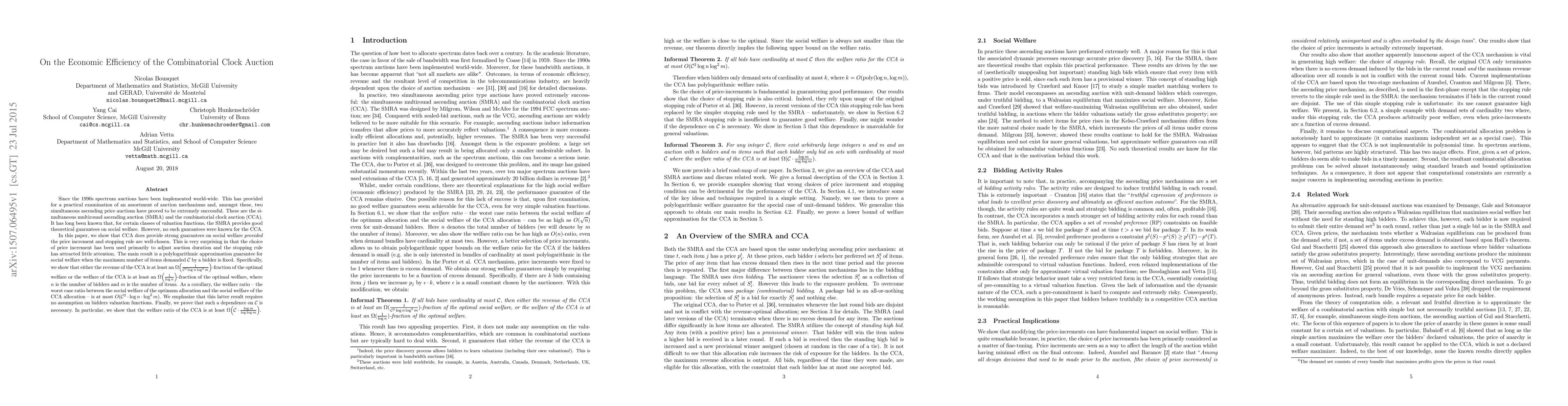 This paper demonstrates that the combinatorial clock auction (CCA) provides strong social welfare guarantees when the price increment and stopping rule are appropriately chosen. It shows a polylogarithmic approximation guarantee for social welfare, establishing that the CCA's welfare is a significant fraction of the optimal welfare, with a worst-case ratio dependent on the maximum number of items demanded by bidders.