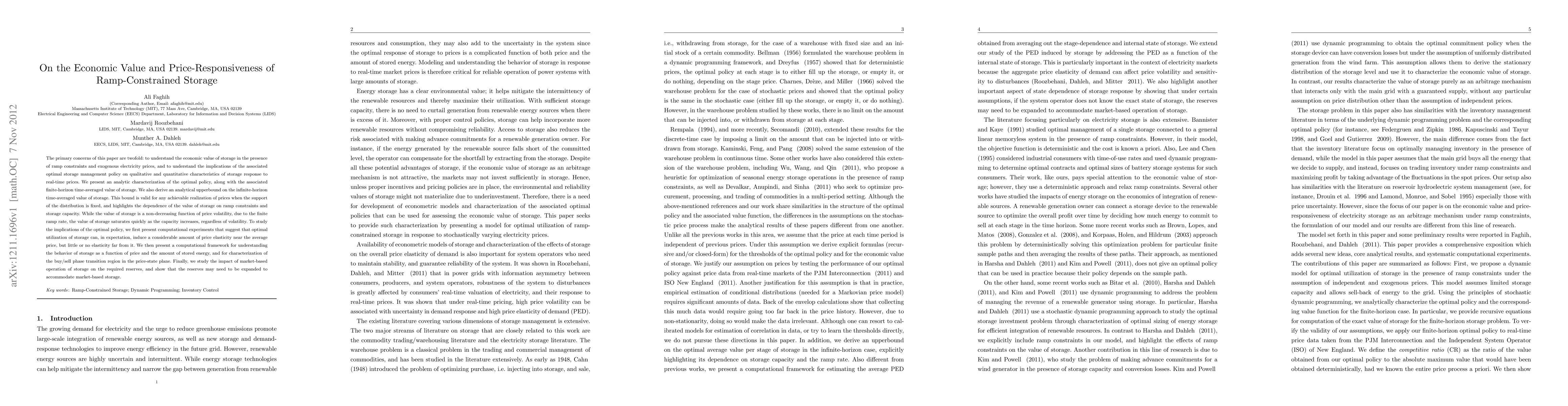 The primary concerns of this paper are twofold: to understand the economic value of storage in the presence of ramp constraints and exogenous electricity prices, and to understand the implications of the associated optimal storage management policy on qualitative and quantitative characteristics of storage response to real-time prices. We present an analytic characterization of the optimal policy, along with the associated finite-horizon time-averaged value of storage. We also derive an analytical upperbound on the infinite-horizon time-averaged value of storage. This bound is valid for any achievable realization of prices when the support of the distribution is fixed, and highlights the dependence of the value of storage on ramp constraints and storage capacity. While the value of storage is a non-decreasing function of price volatility, due to the finite ramp rate, the value of storage saturates quickly as the capacity increases, regardless of volatility. To study the implications of the optimal policy, we first present computational experiments that suggest that optimal utilization of storage can, in expectation, induce a considerable amount of price elasticity near the average price, but little or no elasticity far from it. We then present a computational framework for understanding the behavior of storage as a function of price and the amount of stored energy, and for characterization of the buy/sell phase transition region in the price-state plane. Finally, we study the impact of market-based operation of storage on the required reserves, and show that the reserves may need to be expanded to accommodate market-based storage.