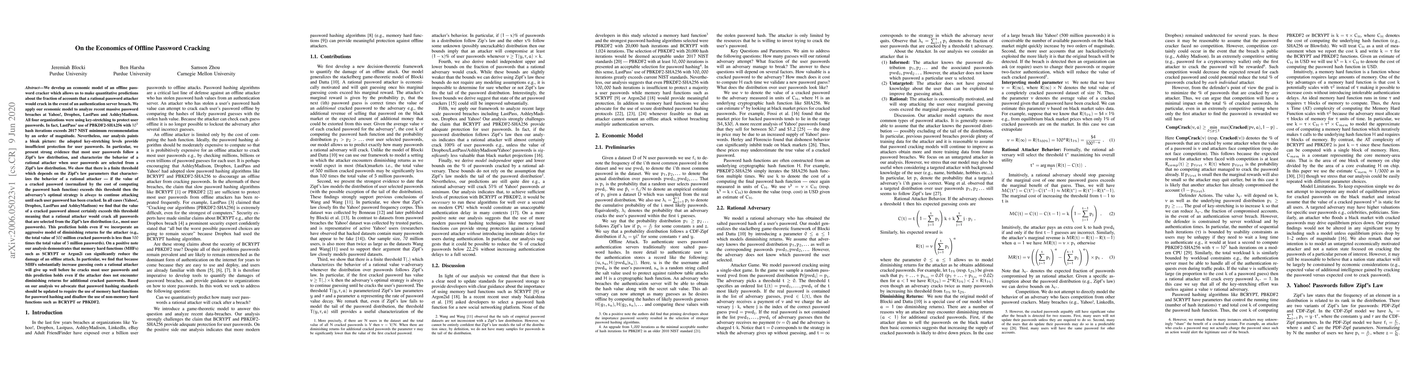 We develop an economic model of an offline password cracker which allows us to make quantitative predictions about the fraction of accounts that a rational password attacker would crack in the event of an authentication server breach. We apply our economic model to analyze recent massive password breaches at Yahoo!, Dropbox, LastPass and AshleyMadison. All four organizations were using key-stretching to protect user passwords. In fact, LastPass' use of PBKDF2-SHA256 with $10^5$ hash iterations exceeds 2017 NIST minimum recommendation by an order of magnitude. Nevertheless, our analysis paints a bleak picture: the adopted key-stretching levels provide insufficient protection for user passwords. In particular, we present strong evidence that most user passwords follow a Zipf's law distribution, and characterize the behavior of a rational attacker when user passwords are selected from a Zipf's law distribution. We show that there is a finite threshold which depends on the Zipf's law parameters that characterizes the behavior of a rational attacker -- if the value of a cracked password (normalized by the cost of computing the password hash function) exceeds this threshold then the adversary's optimal strategy is always to continue attacking until each user password has been cracked. In all cases (Yahoo!, Dropbox, LastPass and AshleyMadison) we find that the value of a cracked password almost certainly exceeds this threshold meaning that a rational attacker would crack all passwords that are selected from the Zipf's law distribution (i.e., most user passwords). This prediction holds even if we incorporate an aggressive model of diminishing returns for the attacker (e.g., the total value of $500$ million cracked passwords is less than $100$ times the total value of $5$ million passwords). See paper for full abstract.