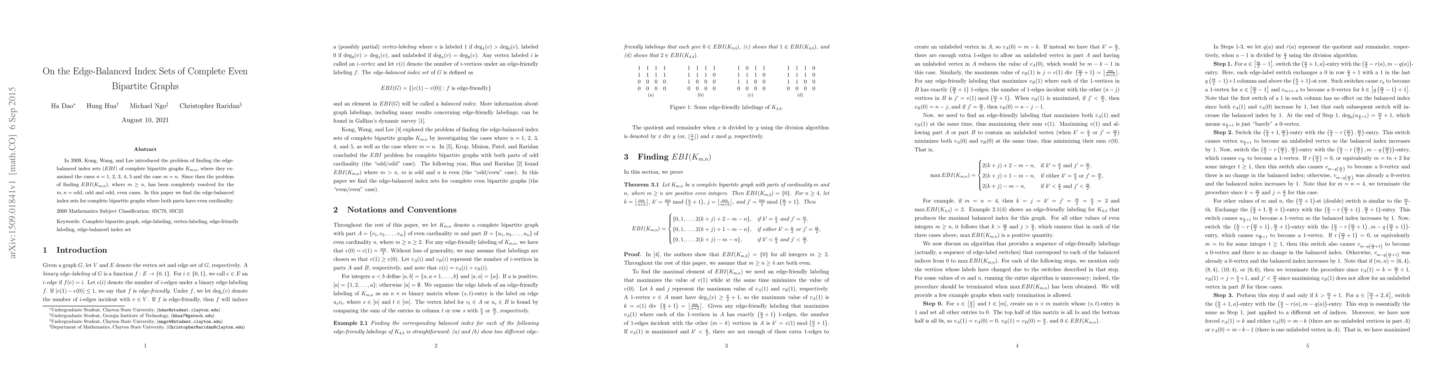 This paper resolves the problem of finding edge-balanced index sets ($EBI$) for complete even bipartite graphs $K_{m,n}$, where both $m$ and $n$ are even, completing the analysis that was previously only resolved for odd-odd and odd-even cases. The findings provide a comprehensive solution for the remaining scenario.