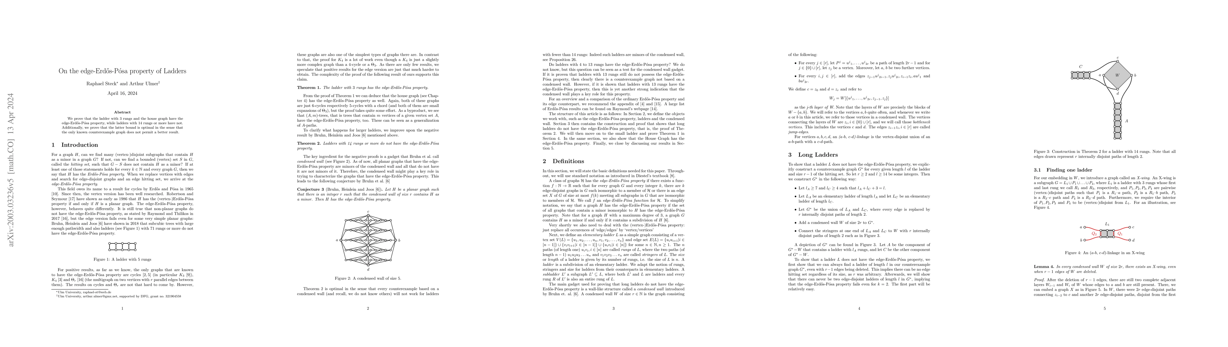 The paper establishes that ladders with 3 rungs and house graphs possess the edge-Erdős-Pósa property, whereas ladders with 14 or more rungs do not. It also demonstrates the optimality of this 14-rung threshold for counterexamples.