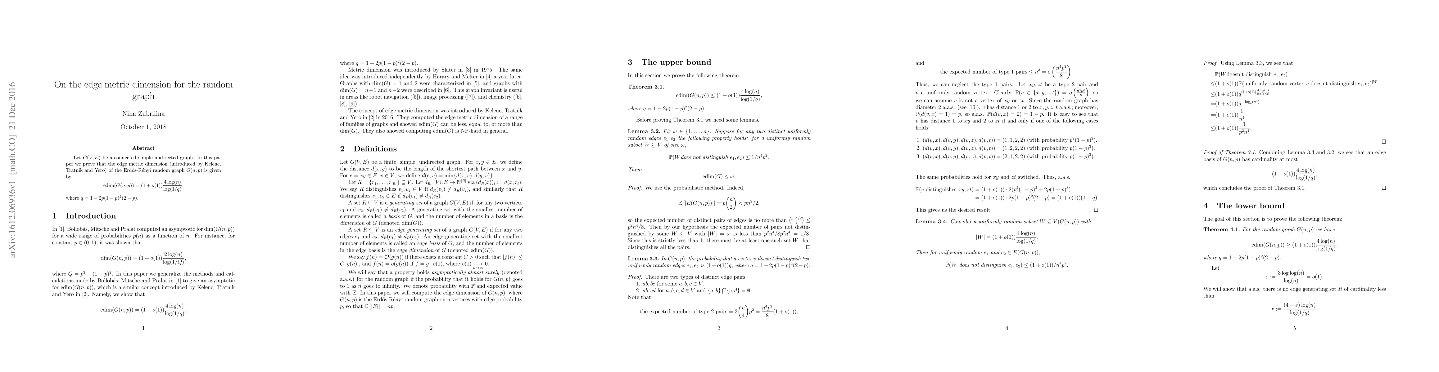 The edge metric dimension of the Erdös-Rényi random graph is found to be approximately rac{4log(n)}{log(1/q)}, where q = 1 - 2p(1-p)^2(2-p) and n is the number of vertices, with an error term of o(1).