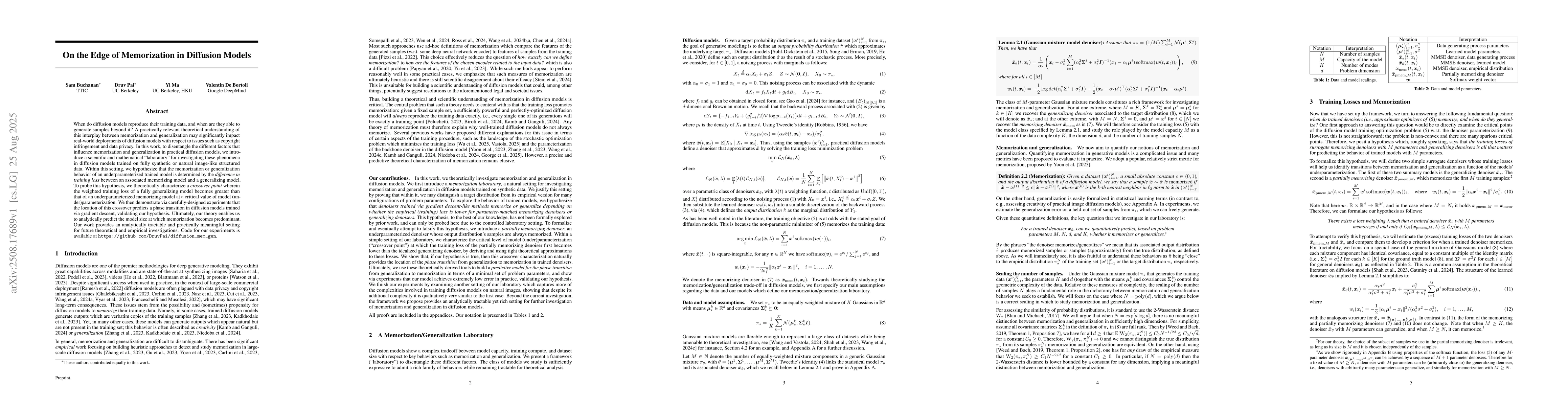 When do diffusion models reproduce their training data, and when are they able to generate samples beyond it? A practically relevant theoretical understanding of this interplay between memorization and generalization may significantly impact real-world deployments of diffusion models with respect to issues such as copyright infringement and data privacy. In this work, to disentangle the different factors that influence memorization and generalization in practical diffusion models, we introduce a scientific and mathematical "laboratory" for investigating these phenomena in diffusion models trained on fully synthetic or natural image-like structured data. Within this setting, we hypothesize that the memorization or generalization behavior of an underparameterized trained model is determined by the difference in training loss between an associated memorizing model and a generalizing model. To probe this hypothesis, we theoretically characterize a crossover point wherein the weighted training loss of a fully generalizing model becomes greater than that of an underparameterized memorizing model at a critical value of model (under)parameterization. We then demonstrate via carefully-designed experiments that the location of this crossover predicts a phase transition in diffusion models trained via gradient descent, validating our hypothesis. Ultimately, our theory enables us to analytically predict the model size at which memorization becomes predominant. Our work provides an analytically tractable and practically meaningful setting for future theoretical and empirical investigations. Code for our experiments is available at https://github.com/DruvPai/diffusion_mem_gen.