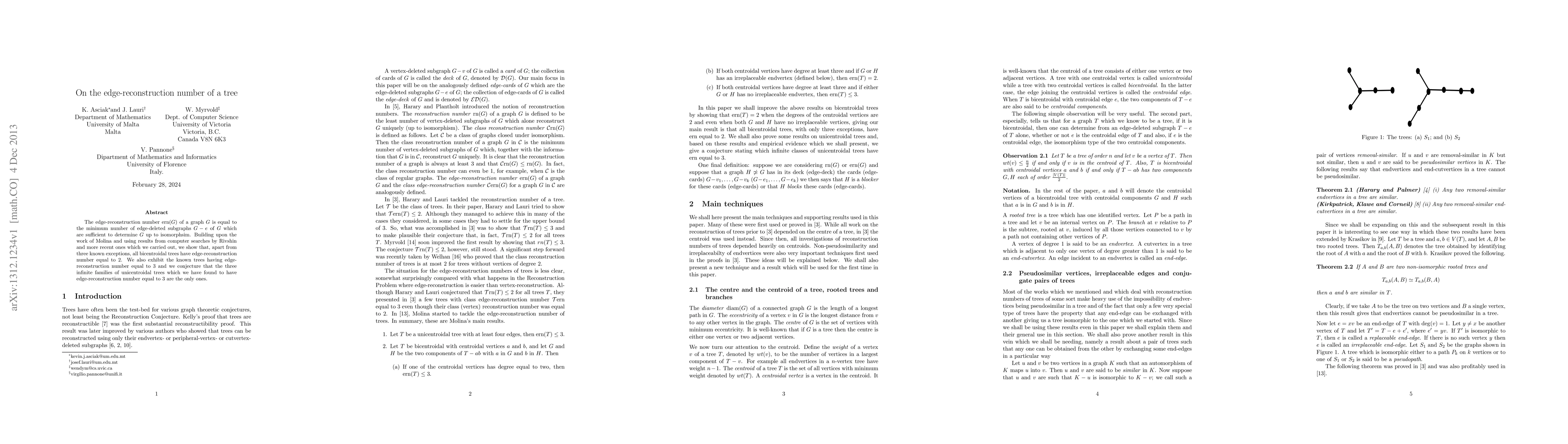 The edge-reconstruction number ern$(G)$ of a graph $G$ is equal to the minimum number of edge-deleted subgraphs $G-e$ of $G$ which are sufficient to determine $G$ up to isomorphsim. Building upon the work of Molina and using results from computer searches by Rivshin and more recent ones which we carried out, we show that, apart from three known exceptions, all bicentroidal trees have edge-reconstruction number equal to 2. We also exhibit the known trees having edge-reconstruction number equal to 3 and we conjecture that the three infinite families of unicentroidal trees which we have found to have edge-reconstruction number equal to 3 are the only ones.