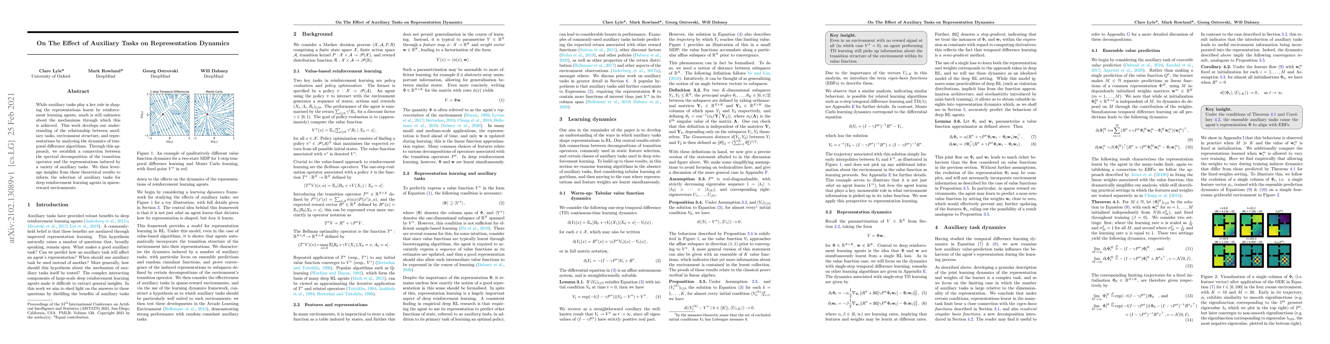 While auxiliary tasks play a key role in shaping the representations learnt by reinforcement learning agents, much is still unknown about the mechanisms through which this is achieved. This work develops our understanding of the relationship between auxiliary tasks, environment structure, and representations by analysing the dynamics of temporal difference algorithms. Through this approach, we establish a connection between the spectral decomposition of the transition operator and the representations induced by a variety of auxiliary tasks. We then leverage insights from these theoretical results to inform the selection of auxiliary tasks for deep reinforcement learning agents in sparse-reward environments.