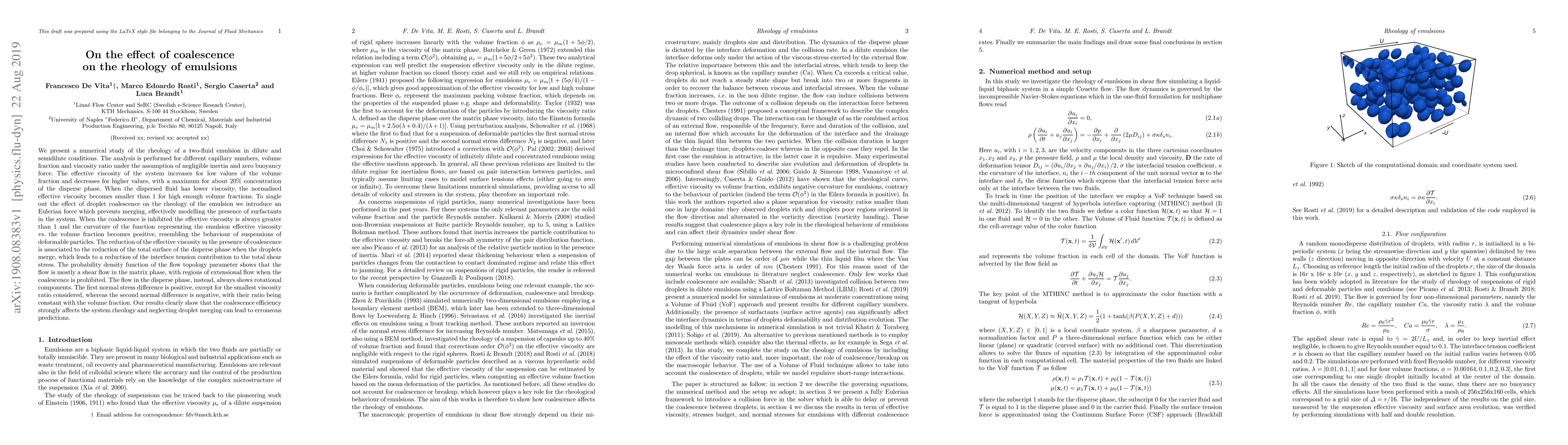 We present a numerical study of the rheology of a two-fluid emulsion in dilute and semidilute conditions. The analysis is performed for different capillary numbers, volume fraction and viscosity ratio under the assumption of negligible inertia and zero buoyancy force. The effective viscosity of the system increases for low values of the volume fraction and decreases for higher values, with a maximum for about 20 % concentration of the disperse phase. When the dispersed fluid has lower viscosity, the normalised effective viscosity becomes smaller than 1 for high enough volume fractions. To single out the effect of droplet coalescence on the rheology of the emulsion we introduce an Eulerian force which prevents merging, effectively modelling the presence of surfactants in the system. When the coalescence is inhibited the effective viscosity is always greater than 1 and the curvature of the function representing the emulsion effective viscosity vs. the volume fraction becomes positive, resembling the behaviour of suspensions of deformable particles. The reduction of the effective viscosity in the presence of coalescence is associated to the reduction of the total surface of the disperse phase when the droplets merge, which leads to a reduction of the interface tension contribution to the total shear stress. The probability density function of the flow topology parameter shows that the flow is mostly a shear flow in the matrix phase, with regions of extensional flow when the coalescence is prohibited. The flow in the disperse phase, instead, always shows rotational components. The first normal stress difference is positive whereas the second normal difference is negative, with their ratio being constant with the volume fraction. Our results clearly show that the coalescence efficiency strongly affects the system rheology and neglecting droplet merging can lead to erroneous predictions.