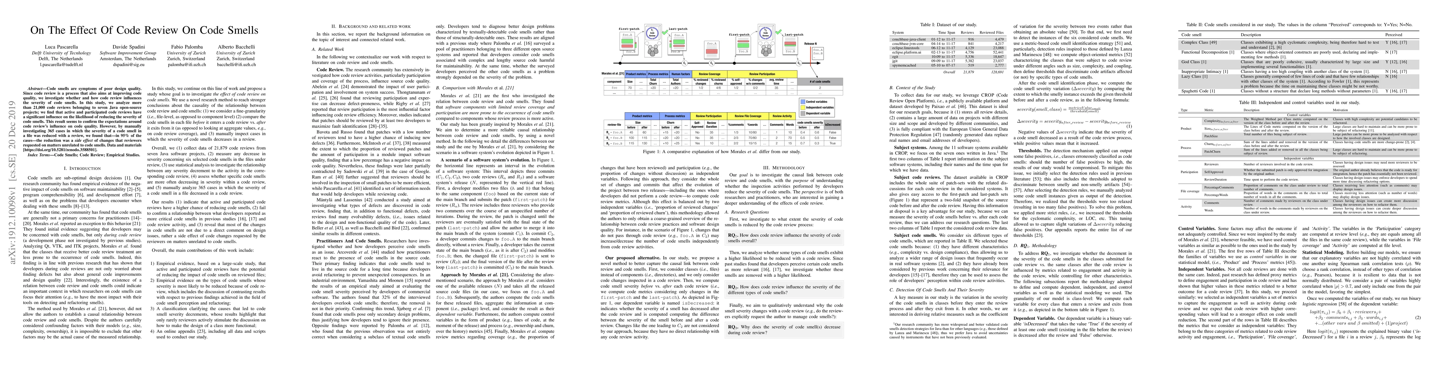 Code smells are symptoms of poor design quality. Since code review is a process that also aims at improving code quality, we investigate whether and how code review influences the severity of code smells. In this study, we analyze more than 21,000 code reviews belonging to seven Java open-source projects; we find that active and participated code reviews have a significant influence on the likelihood of reducing the severity of code smells. This result seems to confirm the expectations around code review's influence on code quality. However, by manually investigating 365 cases in which the severity of a code smell in a file was reduced with a review, we found that-in 95% of the cases-the reduction was a side effect of changes that reviewers requested on matters unrelated to code smells. Data and materials [https://doi.org/10.5281/zenodo.3588501].