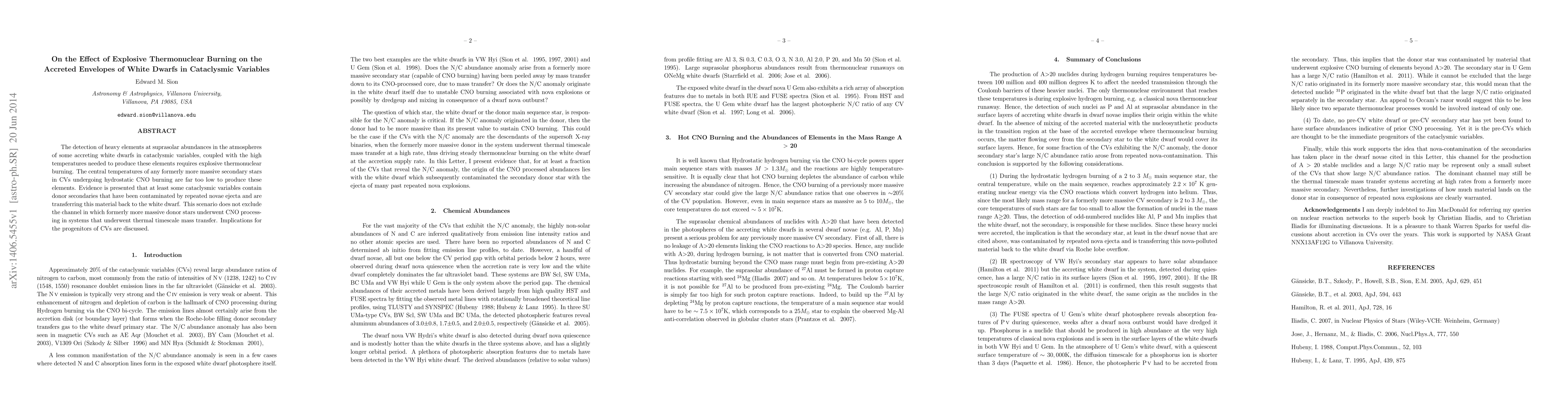 This paper investigates how explosive thermonuclear burning affects the accreted envelopes of white dwarfs in cataclysmic variables, finding that heavy elements in their atmospheres likely result from such burning. The study suggests that some donor stars in these systems have been contaminated by nova ejecta, influencing the material transferred back to the white dwarf.