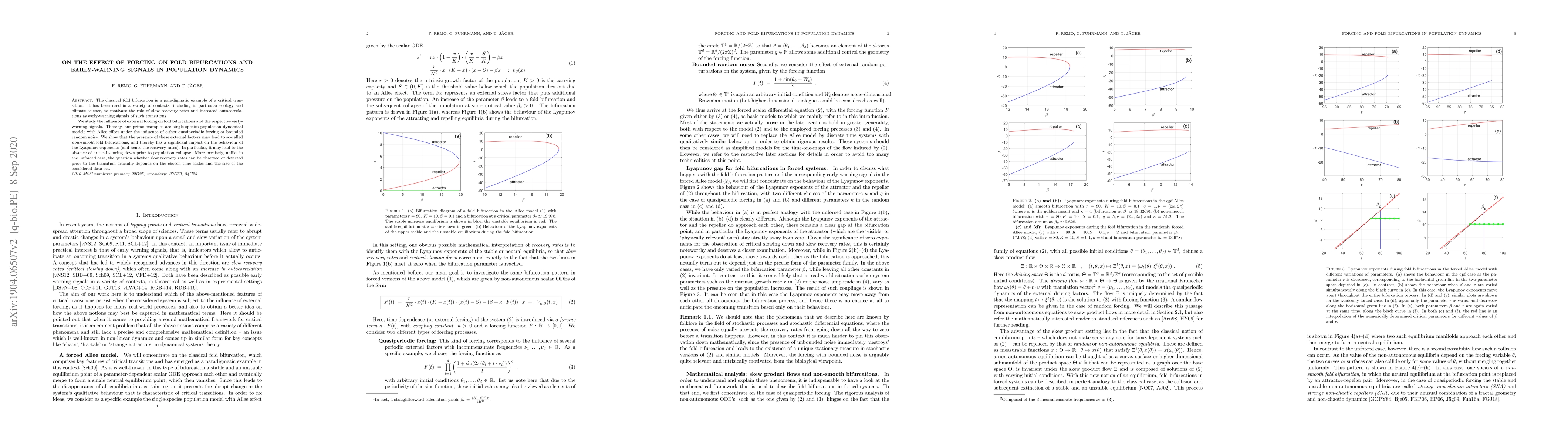 The paper introduces a rigorous mathematical framework for analyzing fold bifurcations under external forcing in population dynamics, incorporating concepts from ergodic theory and skew-product flows.