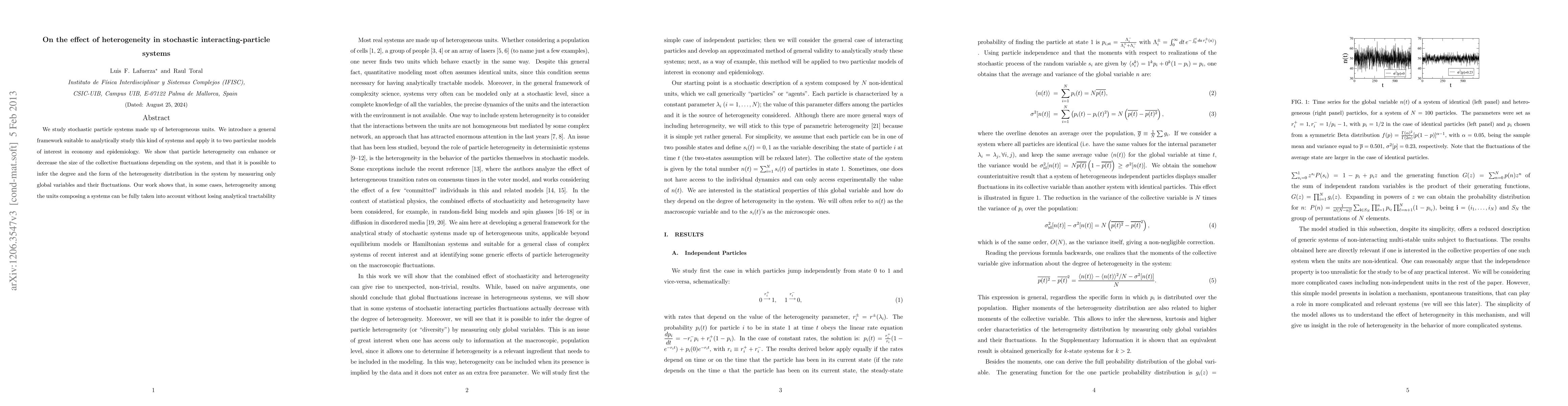 This paper develops a framework to analyze heterogeneous stochastic particle systems, demonstrating its application to economic and epidemiological models. It finds that particle heterogeneity can either amplify or dampen collective fluctuations, and infers heterogeneity distribution from global variables and their fluctuations.