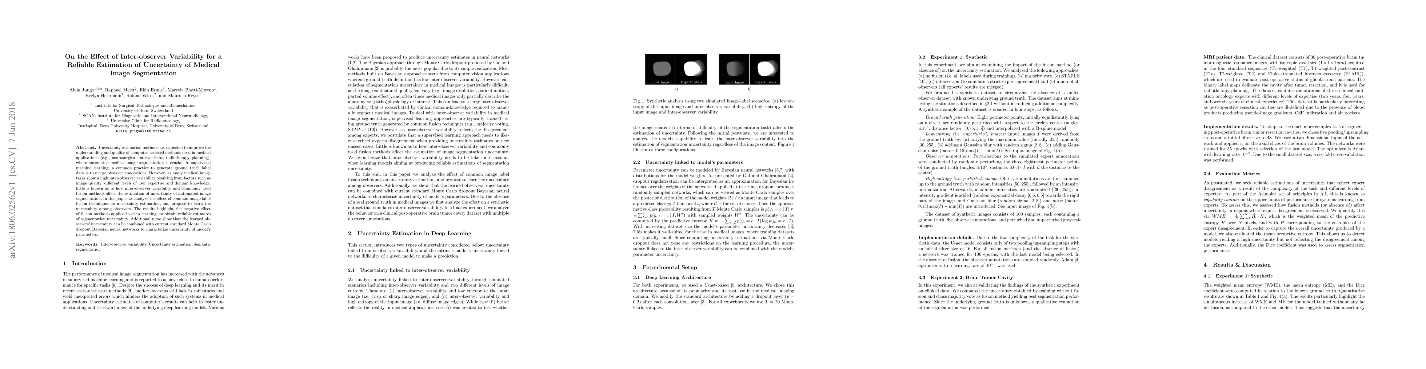 Uncertainty estimation methods are expected to improve the understanding and quality of computer-assisted methods used in medical applications (e.g., neurosurgical interventions, radiotherapy planning), where automated medical image segmentation is crucial. In supervised machine learning, a common practice to generate ground truth label data is to merge observer annotations. However, as many medical image tasks show a high inter-observer variability resulting from factors such as image quality, different levels of user expertise and domain knowledge, little is known as to how inter-observer variability and commonly used fusion methods affect the estimation of uncertainty of automated image segmentation. In this paper we analyze the effect of common image label fusion techniques on uncertainty estimation, and propose to learn the uncertainty among observers. The results highlight the negative effect of fusion methods applied in deep learning, to obtain reliable estimates of segmentation uncertainty. Additionally, we show that the learned observers' uncertainty can be combined with current standard Monte Carlo dropout Bayesian neural networks to characterize uncertainty of model's parameters.