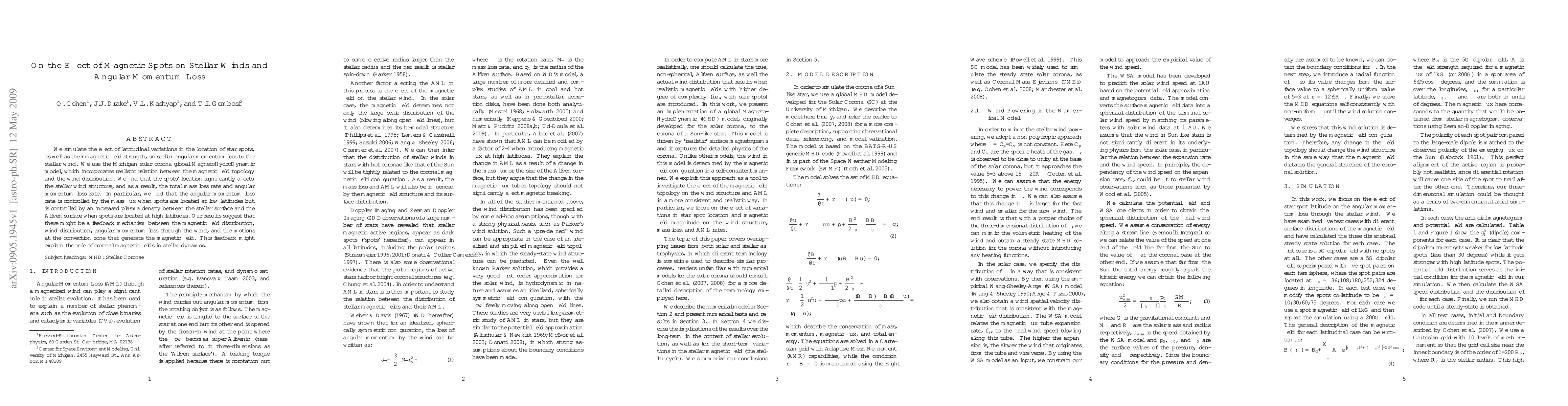 We simulate the effect of latitudinal variations in the location of star spots, as well as their magnetic field strength, on stellar angular momentum loss to the stellar wind. We use the Michigan solar corona global MagnetoHydroDynamic model, which incorporates realistic relation between the magnetic field topology and the wind distribution. We find that the spots location significantly affects the stellar wind structure, and as a result, the total mass loss rate and angular momentum loss rate. In particular, we find that the angular momentum loss rate is controlled by the mass flux when spots are located at low latitudes but is controlled by an increased plasma density between the stellar surface and the Alfven surface when spots are located at high latitudes. Our results suggest that there might be a feedback mechanism between the magnetic field distribution, wind distribution, angular momentum loss through the wind, and the motions at the convection zone that generate the magnetic field. This feedback might explain the role of coronal magnetic fields in stellar dynamos.