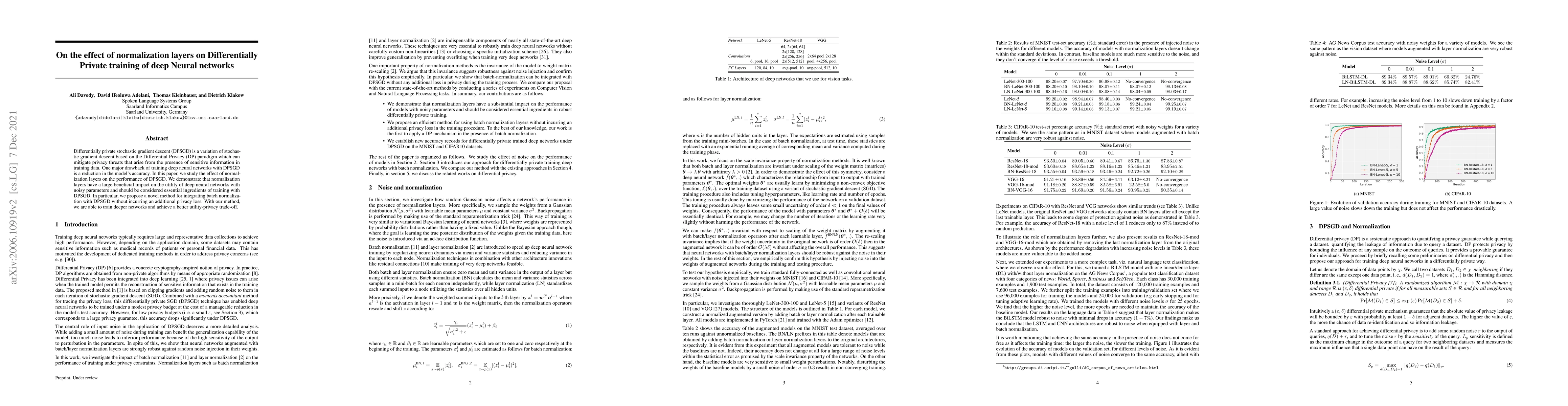 Differentially private stochastic gradient descent (DPSGD) is a variation of stochastic gradient descent based on the Differential Privacy (DP) paradigm, which can mitigate privacy threats that arise from the presence of sensitive information in training data. However, one major drawback of training deep neural networks with DPSGD is a reduction in the models accuracy. In this paper, we study the effect of normalization layers on the performance of DPSGD. We demonstrate that normalization layers significantly impact the utility of deep neural networks with noisy parameters and should be considered essential ingredients of training with DPSGD. In particular, we propose a novel method for integrating batch normalization with DPSGD without incurring an additional privacy loss. With our approach, we are able to train deeper networks and achieve a better utility-privacy trade-off.
