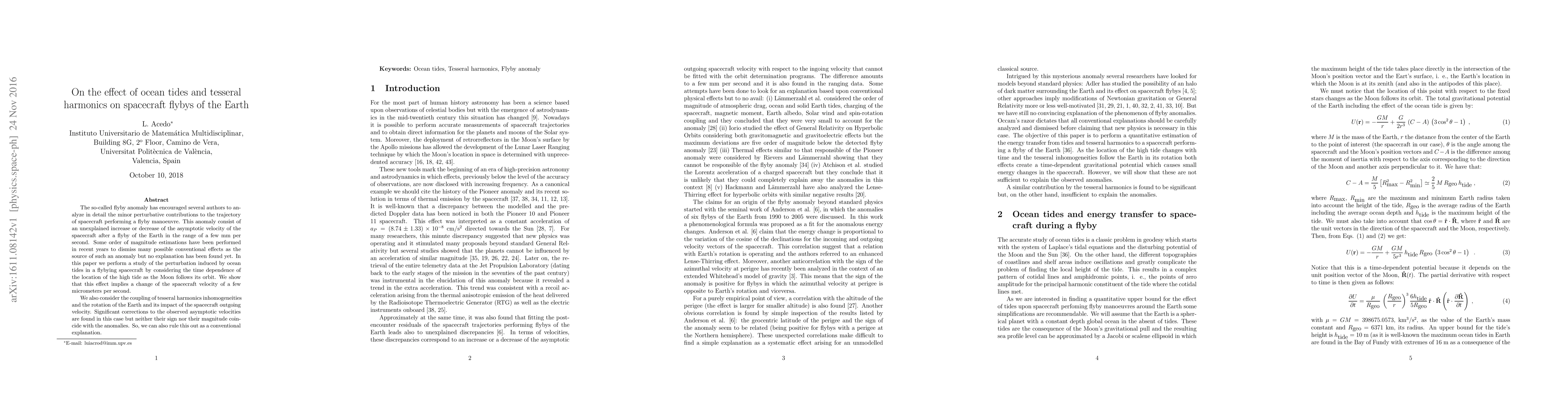 A study examines ocean tides' effect on spacecraft flybys of Earth, finding that tidal perturbations cause velocity changes of a few micrometers per second, ruling out ocean tides as the source of the so-called 'flyby anomaly'. The researchers also investigate tesseral harmonics and Earth's rotation, but find no significant impact.