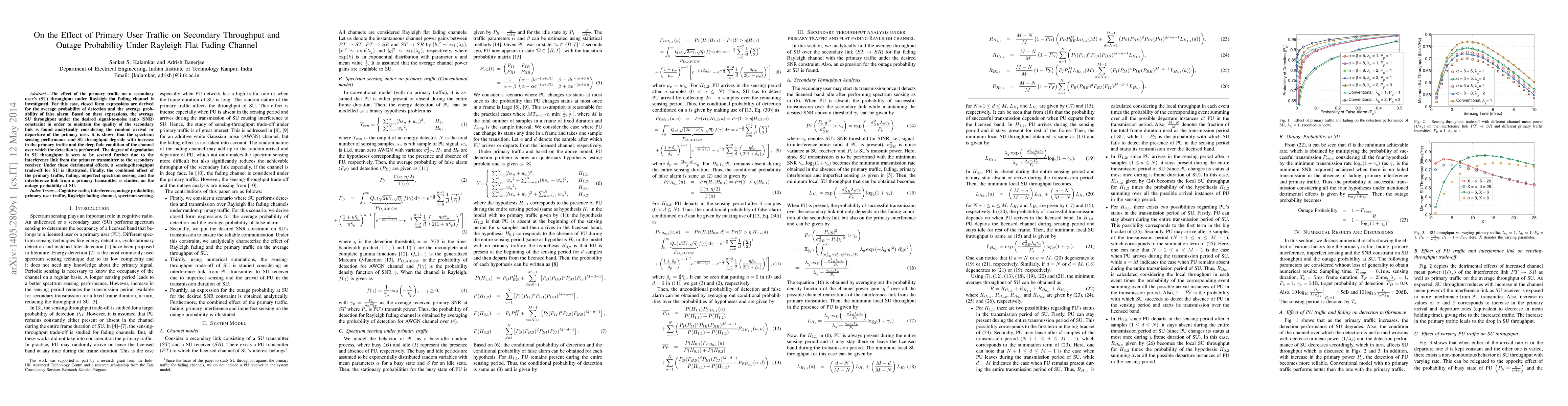 Research investigates how primary user traffic affects secondary user throughput and outage probability in a Rayleigh flat fading channel, finding that increasing primary traffic degrades performance and leads to a trade-off between spectrum sensing and throughput.