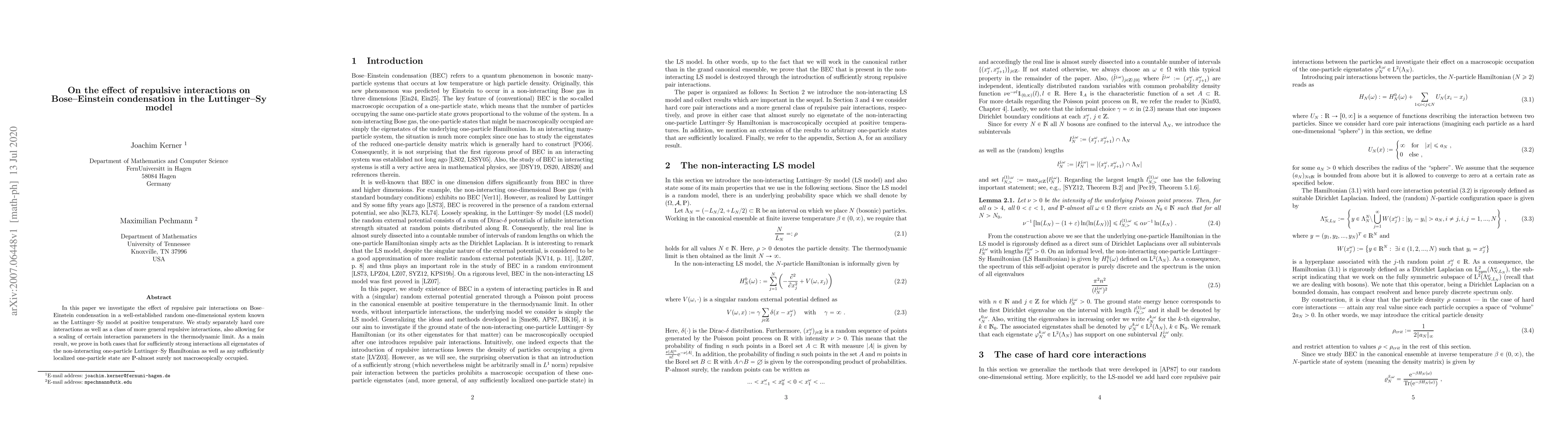 This paper examines how repulsive pair interactions affect Bose-Einstein condensation in the Luttinger-Sy model, a one-dimensional random system, at positive temperatures. It finds that for sufficiently strong interactions, neither the eigenstates of the non-interacting Hamiltonian nor localized states are likely to be macroscopically occupied.