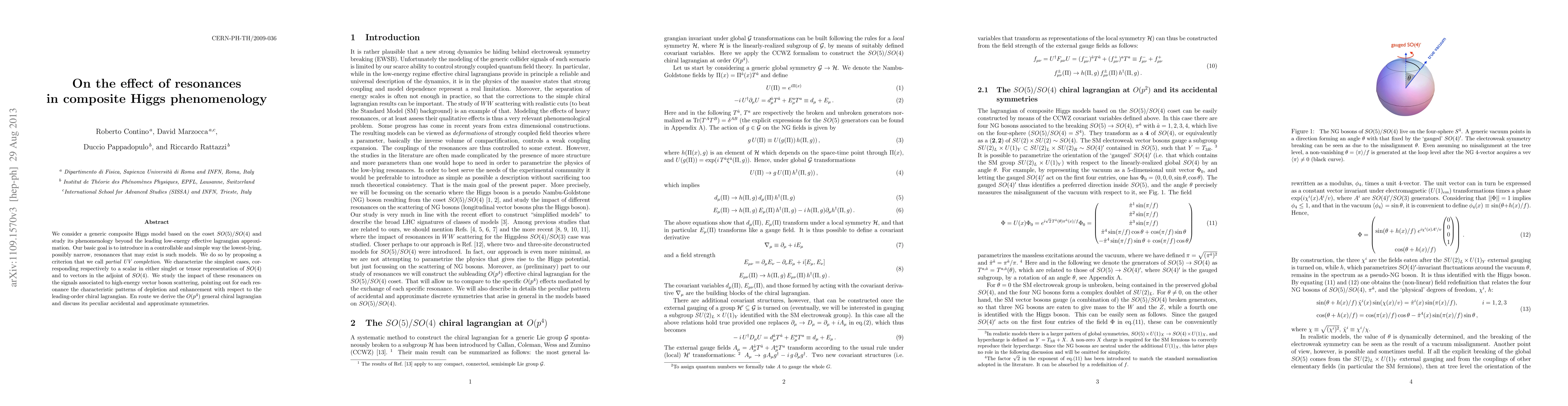 We consider a generic composite Higgs model based on the coset SO(5)/SO(4) and study its phenomenology beyond the leading low-energy effective lagrangian approximation. Our basic goal is to introduce in a controllable and simple way the lowest-lying, possibly narrow, resonances that may exist is such models. We do so by proposing a criterion that we call partial UV completion. We characterize the simplest cases, corresponding respectively to a scalar in either singlet or tensor representation of SO(4) and to vectors in the adjoint of SO(4). We study the impact of these resonances on the signals associated to high-energy vector boson scattering, pointing out for each resonance the characteristic patterns of depletion and enhancement with respect to the leading-order chiral lagrangian. En route we derive the O(p^4) general chiral lagrangian and discuss its peculiar accidental and approximate symmetries.