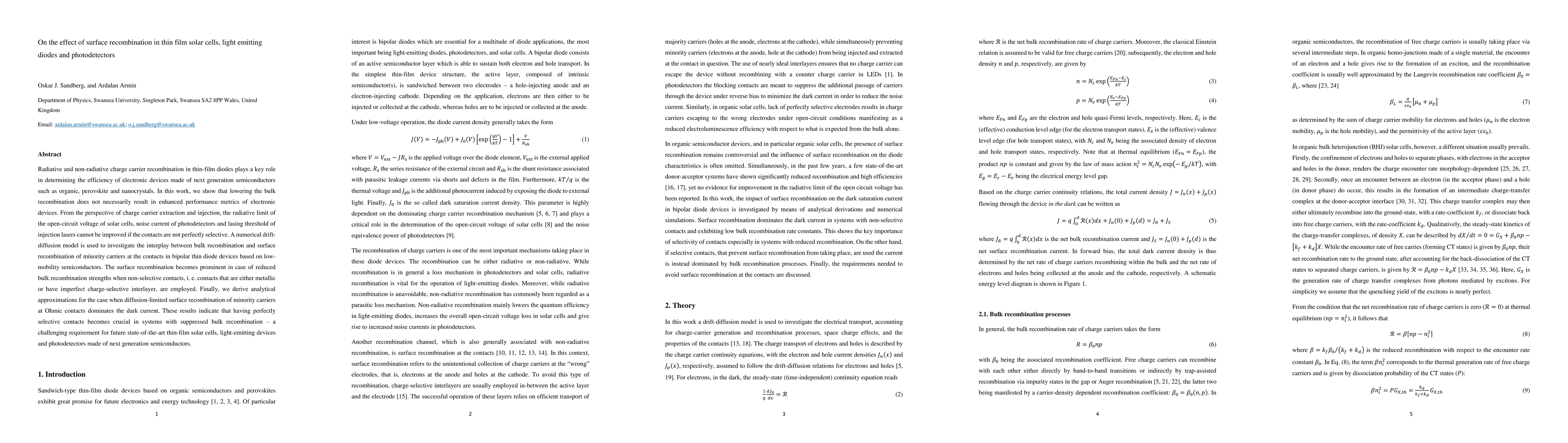 This paper investigates the impact of surface recombination on the efficiency of thin-film electronic devices, showing that reducing bulk recombination does not necessarily improve performance if the contacts are not perfectly selective. It emphasizes the importance of having selective contacts to optimize devices like solar cells, LEDs, and photodetectors, especially when bulk recombination is suppressed.