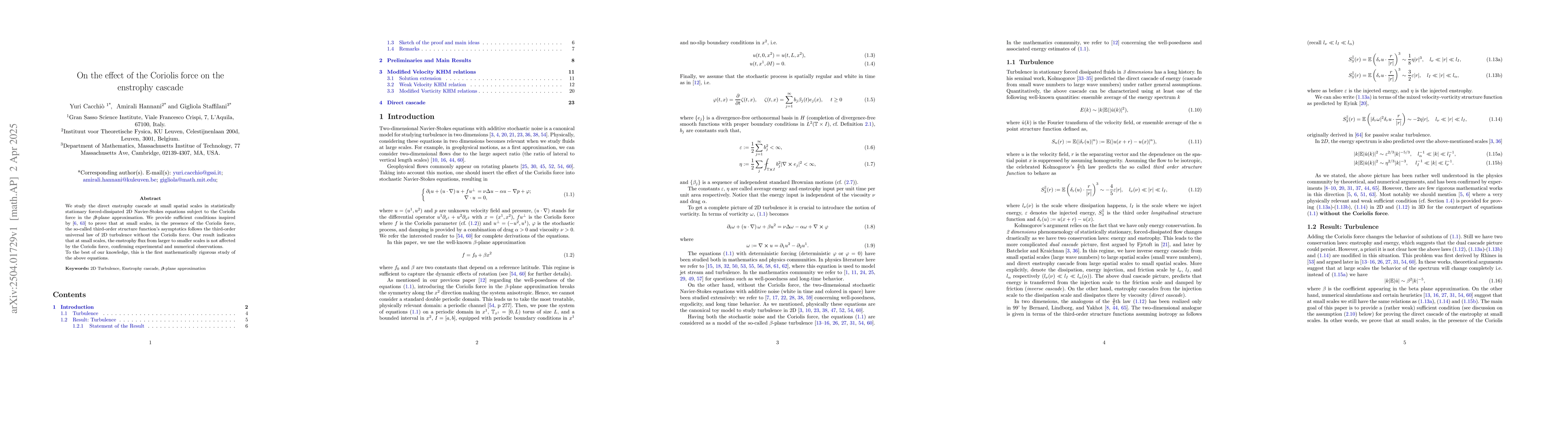 The research employs mathematical analysis of the 2D Navier-Stokes equations under the Coriolis force in the $eta$-plane approximation, focusing on the direct enstrophy cascade at small spatial scales.