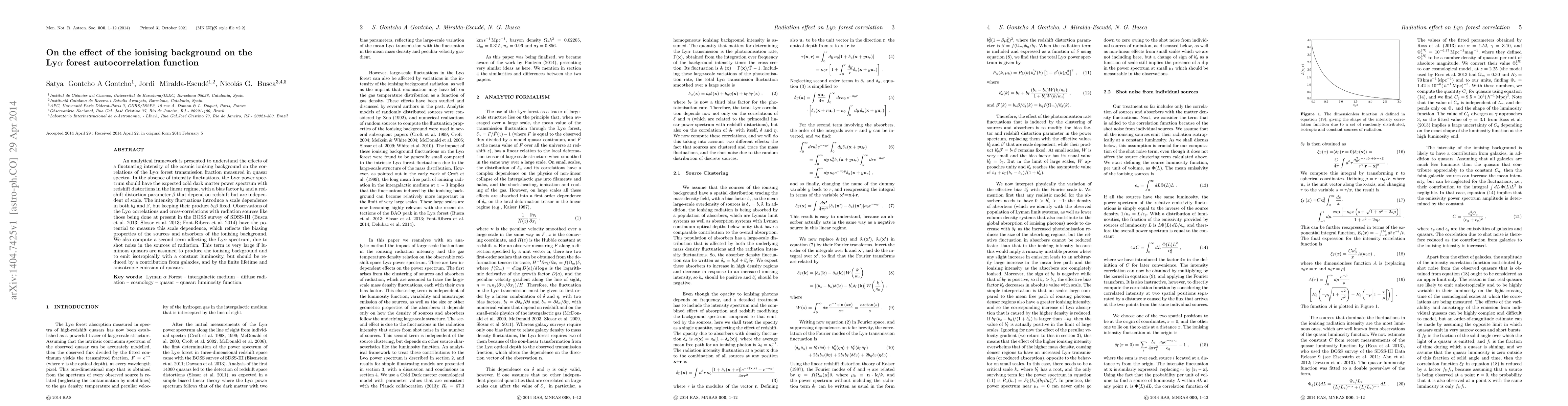 An analytical framework is presented to understand the effects of a fluctuating intensity of the cosmic ionising background on the correlations of the Ly{\alpha} forest transmission fraction measured in quasar spectra. In the absence of intensity fluctuations, the Ly{\alpha} power spectrum should have the expected cold dark matter power spectrum with redshift distortions in the linear regime, with a bias factor b_{\delta} and a redshift distortion parameter {\beta} that depend on redshift but are independent of scale. The intensity fluctuations introduce a scale dependence in both b_{\delta} and {\beta}, but keeping their product b_{\delta}{\beta} fixed. Observations of the Ly{\alpha} correlations and cross-correlations with radiation sources like those being done at present in the BOSS survey of SDSS-III (Busca et al. 2013; Slosar et al. 2013; Font-Ribera et al. 2014) have the potential to measure this scale dependence, which reflects the biasing properties of the sources and absorbers of the ionising background. We also compute a second term affecting the Ly{\alpha} spectrum, due to shot noise in the sources of radiation. This term is very large if luminous quasars are assumed to produce the ionising background and to emit isotropically with a constant luminosity, but should be reduced by a contribution from galaxies, and by the finite lifetime and anisotropic emission of quasars.