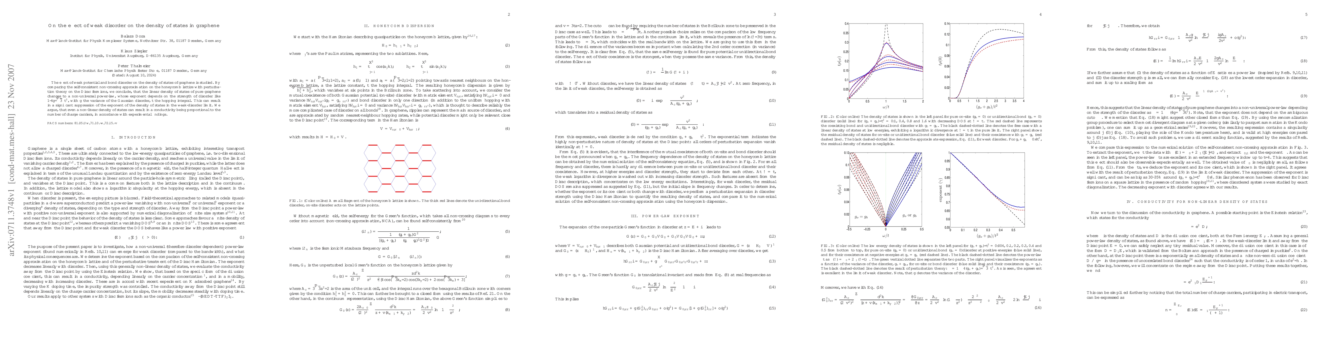 This study investigates the impact of weak potential and bond disorder on graphene's density of states, revealing a shift from linear to a non-universal power-law dependent on disorder strength. Even with a non-linear density of states, conductivity remains proportional to charge carriers, aligning with experimental observations.