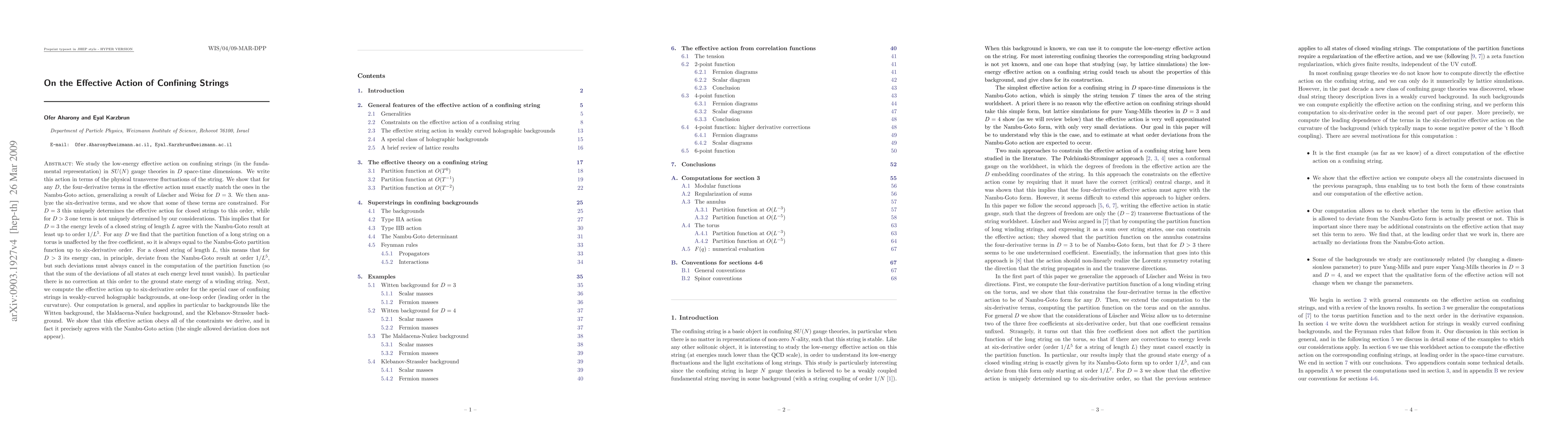 This paper investigates the low-energy effective action for confining strings in SU(N) gauge theories, demonstrating that four-derivative terms match those in the Nambu-Goto action. It finds that six-derivative terms are partially constrained, uniquely determining the effective action for D=3 strings and leaving one term undetermined for D>3, ensuring agreement with the Nambu-Goto result up to order 1/L^5.