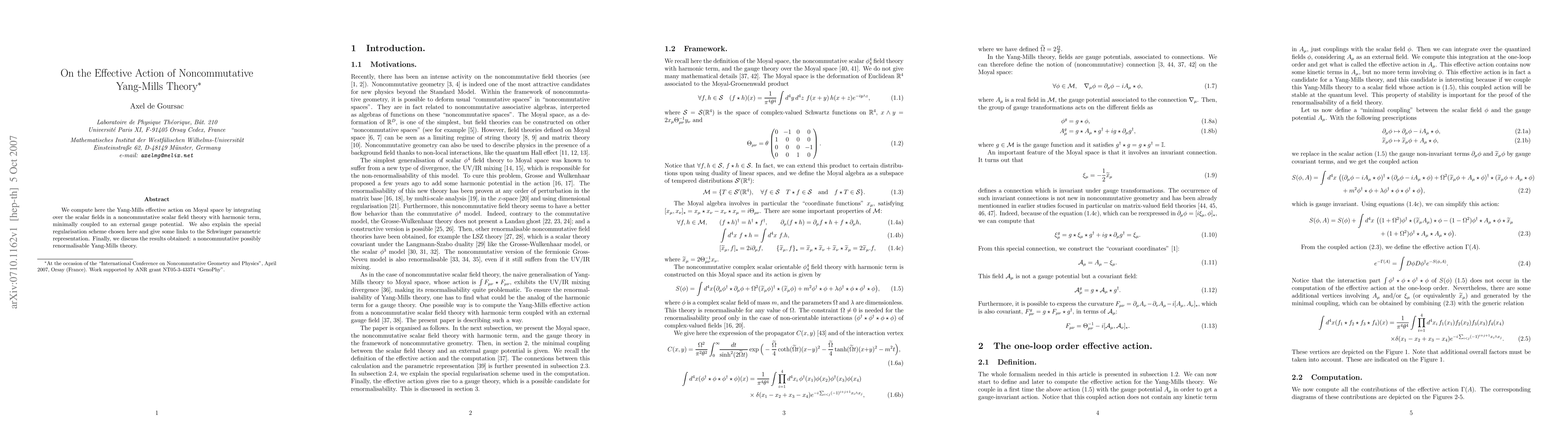 This paper computes the Yang-Mills effective action on Moyal space by integrating over scalar fields in a noncommutative theory and introduces a special regularisation scheme. The results suggest a potentially renormalisable noncommutative Yang-Mills theory.