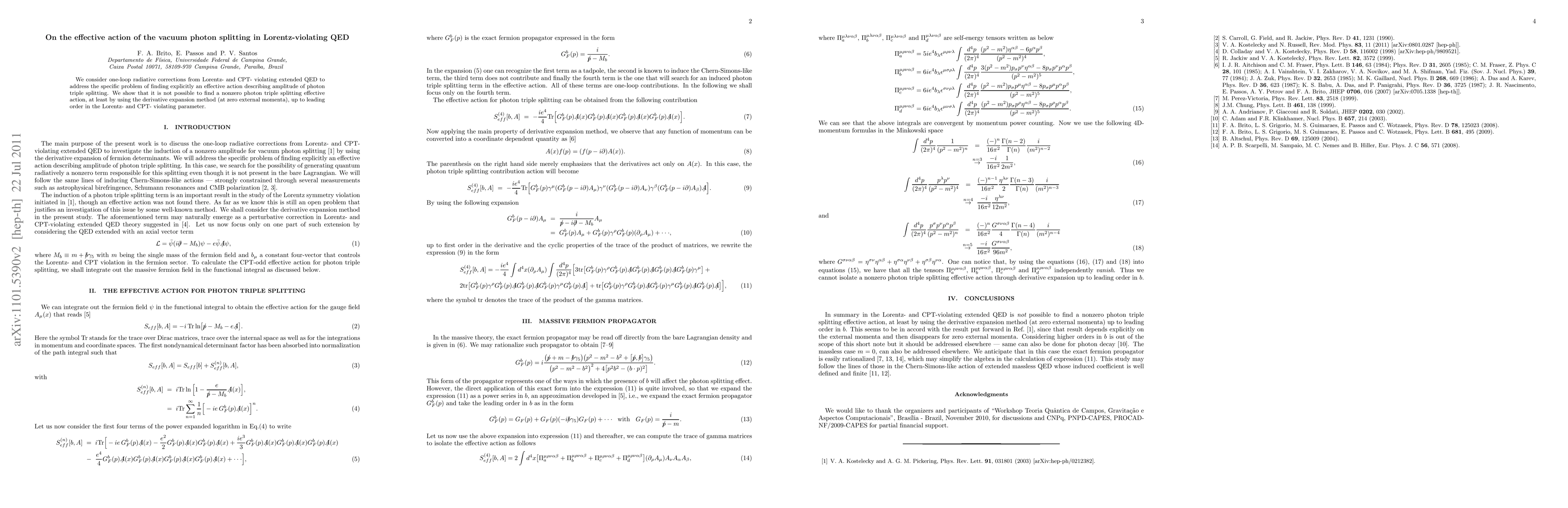 We consider one-loop radiative corrections from Lorentz- and CPT- violating extended QED to address the specific problem of finding explicitly an effective action describing amplitude of photon triple splitting. We show that it is not possible to find a nonzero photon triple splitting effective action, at least by using the derivative expansion method (at zero external momenta), up to leading order in the Lorentz- and CPT- violating parameter.