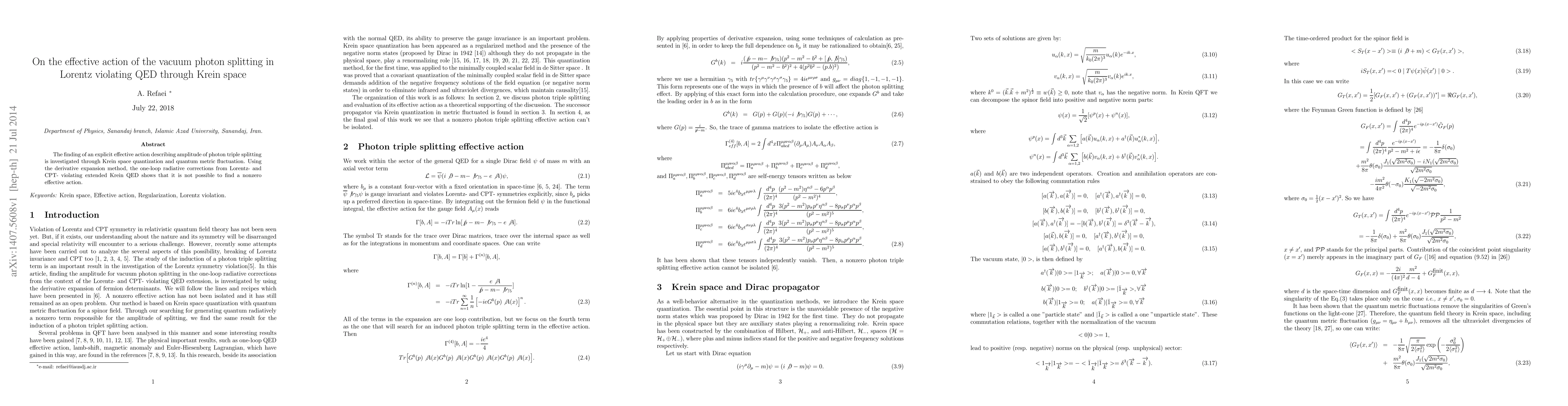 The finding of an explicit effective action describing amplitude of photon triple splitting is investigated through Krein space quantization and quantum metric fluctuation. Using the derivative expansion method, the one-loop radiative corrections from Lorentz- and CPT- violating extended Krein QED shows that it is not possible to find a nonzero effective action.