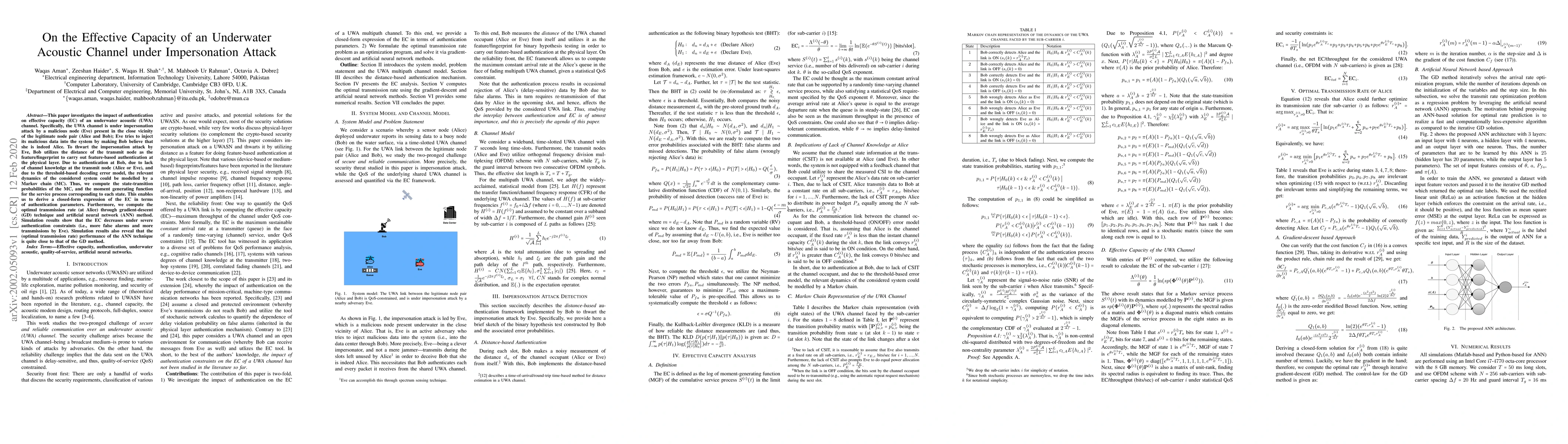 This paper investigates the impact of authentication on effective capacity (EC) of an underwater acoustic (UWA) channel. Specifically, the UWA channel is under impersonation attack by a malicious node (Eve) present in the close vicinity of the legitimate node pair (Alice and Bob); Eve tries to inject its malicious data into the system by making Bob believe that she is indeed Alice. To thwart the impersonation attack by Eve, Bob utilizes the distance of the transmit node as the feature/fingerprint to carry out feature-based authentication at the physical layer. Due to authentication at Bob, due to lack of channel knowledge at the transmit node (Alice or Eve), and due to the threshold-based decoding error model, the relevant dynamics of the considered system could be modelled by a Markov chain (MC). Thus, we compute the state-transition probabilities of the MC, and the moment generating function for the service process corresponding to each state. This enables us to derive a closed-form expression of the EC in terms of authentication parameters. Furthermore, we compute the optimal transmission rate (at Alice) through gradient-descent (GD) technique and artificial neural network (ANN) method. Simulation results show that the EC decreases under severe authentication constraints (i.e., more false alarms and more transmissions by Eve). Simulation results also reveal that the (optimal transmission rate) performance of the ANN technique is quite close to that of the GD method.