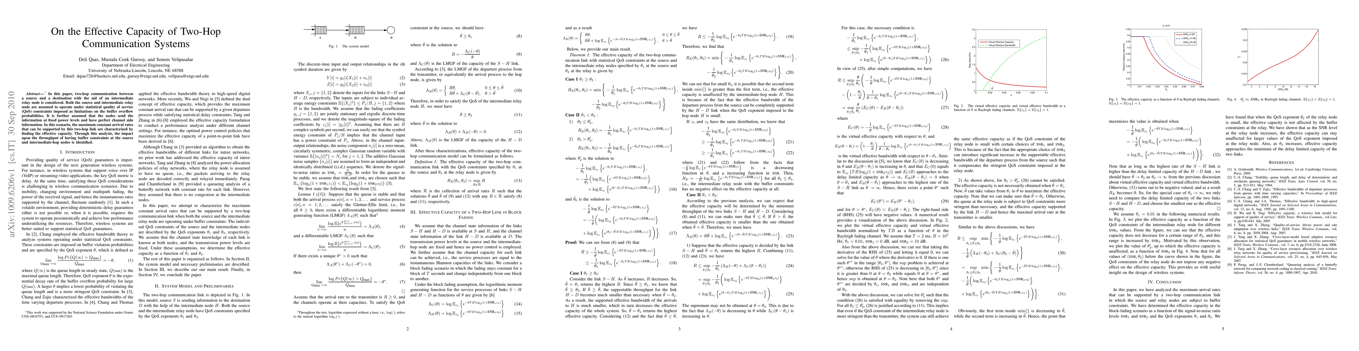 This paper investigates the effective capacity of a two-hop communication system with a relay node, under statistical QoS constraints that limit buffer overflow. It determines the maximum constant arrival rates supported by the system and analyzes the impact of buffer constraints on throughput.