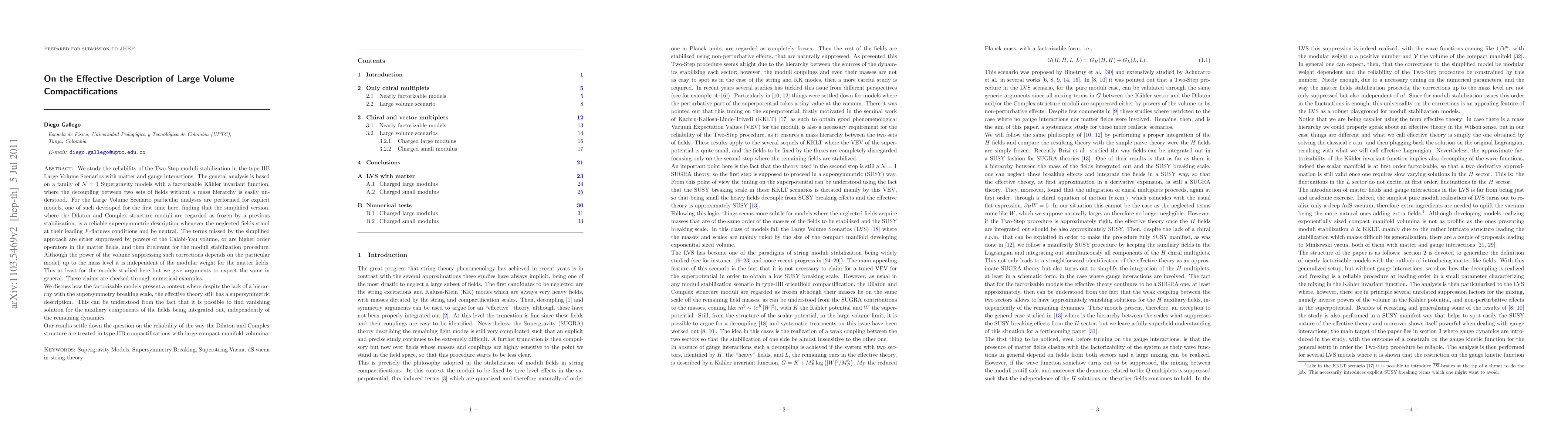 We study the reliability of the Two-Step moduli stabilization in the type-IIB Large Volume Scenarios with matter and gauge interactions. The general analysis is based on a family of N=1 Supergravity models with a factorizable Kaehler invariant function, where the decoupling between two sets of fields without a mass hierarchy is easily understood. For the Large Volume Scenario particular analyses are performed for explicit models, one of such developed for the first time here, finding that the simplified version, where the Dilaton and Complex structure moduli are regarded as frozen by a previous stabilization, is a reliable supersymmetric description whenever the neglected fields stand at their leading F-flatness conditions and be neutral. The terms missed by the simplified approach are either suppressed by powers of the Calabi-Yau volume, or are higher order operators in the matter fields, and then irrelevant for the moduli stabilization rocedure. Although the power of the volume suppressing such corrections depends on the particular model, up to the mass level it is independent of the modular weight for the matter fields. This at least for the models studied here but we give arguments to expect the same in general. These claims are checked through numerical examples. We discuss how the factorizable models present a context where despite the lack of a hierarchy with the supersymmetry breaking scale, the effective theory still has a supersymmetric description. This can be understood from the fact that it is possible to find vanishing solution for the auxiliary components of the fields being integrated out, independently of the remaining dynamics. Our results settle down the question on the reliability of the way the Dilaton and Complex structure are treated in type-IIB compactifications with large compact manifold volumina.