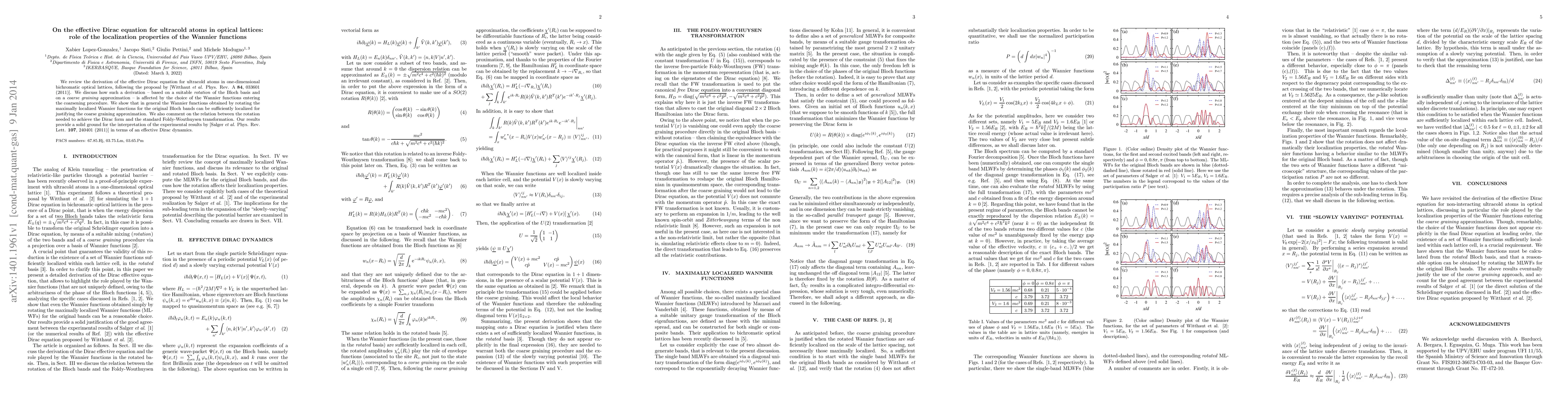 This paper reviews the derivation of the effective Dirac equation for ultracold atoms in optical lattices, emphasizing how the localization properties of Wannier functions influence the coarse-graining approximation. The authors show that suitably rotated Wannier functions can justify the approximation and discuss the connection between the required rotation and the Foldy-Wouthuysen transformation, supporting the interpretation of experimental Dirac dynamics results.