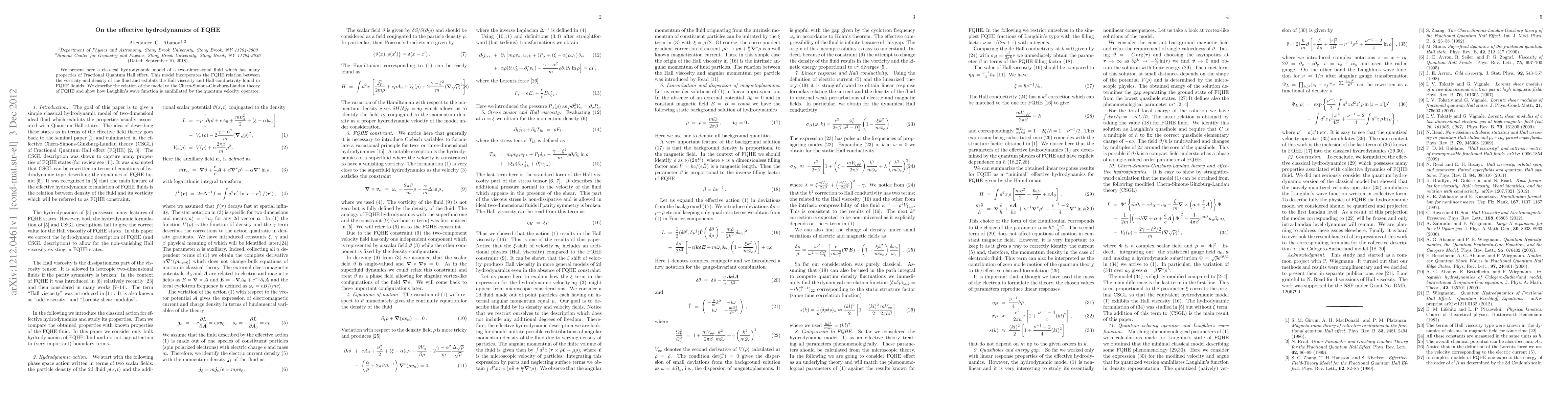 This paper introduces a classical hydrodynamic model of a two-dimensional fluid that mimics the Fractional Quantum Hall Effect (FQHE), demonstrating Hall viscosity and conductivity, and relates it to the Chern-Simons-Ginzburg-Landau theory, showing Laughlin's wave function's annihilation by the quantum velocity operator.
