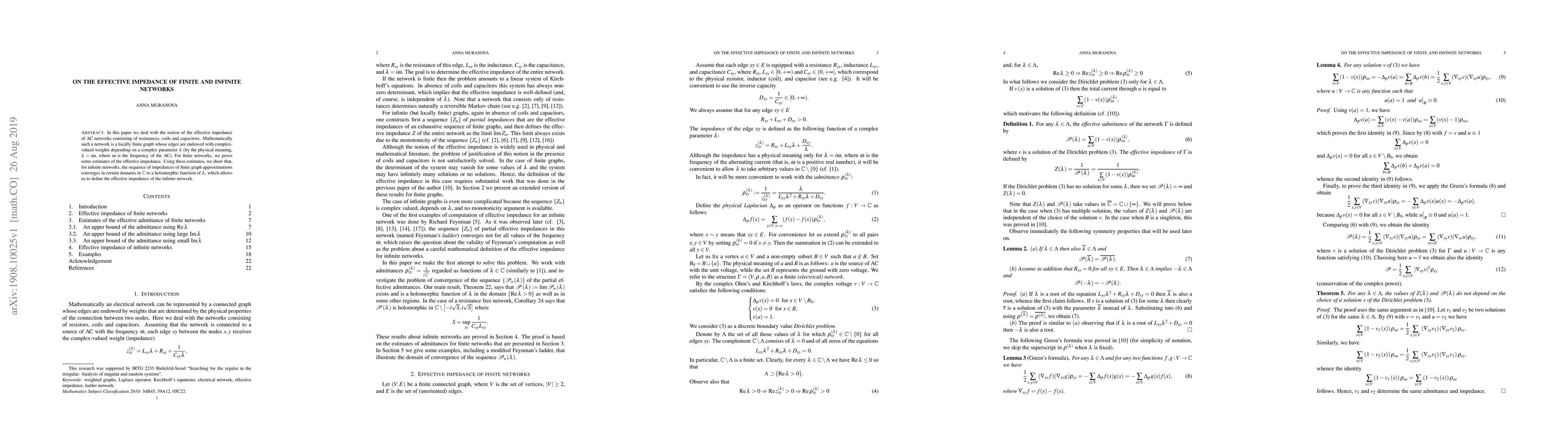 This paper investigates the effective impedance of AC networks composed of resistances, coils, and capacitors, modeled as locally finite graphs with complex-valued weights. For finite networks, it provides impedance estimates, and for infinite networks, it demonstrates convergence of finite approximations to define a holomorphic function representing the effective impedance.
