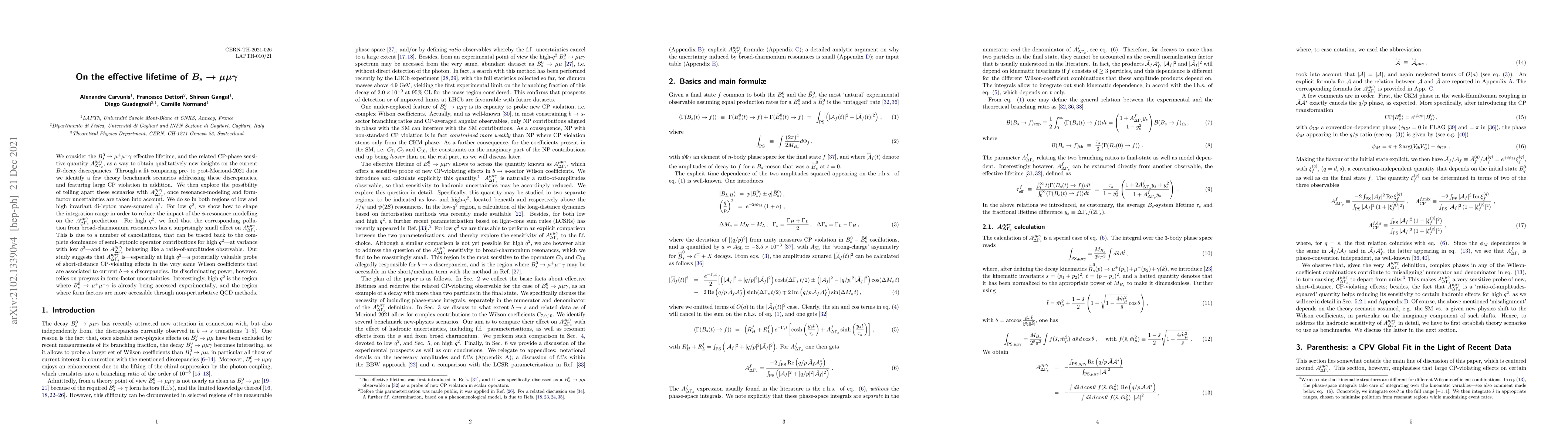 We consider the $B^0_s \to \mu^{+} \mu^{-} \gamma$ effective lifetime, and the related CP-phase sensitive quantity $A_{\Delta\Gamma_s}^{\mu \mu \gamma}$, as a way to obtain qualitatively new insights on the current $B$-decay discrepancies. Through a fit comparing pre- to post-Moriond-2021 data we identify a few theory benchmark scenarios addressing these discrepancies, and featuring large CP violation in addition. We then explore the possibility of telling apart these scenarios with $A_{\Delta\Gamma_s}^{\mu \mu \gamma}$, once resonance-modeling and form-factor uncertainties are taken into account. We do so in both regions of low and high invariant di-lepton mass-squared $q^2$. For low $q^2$, we show how to shape the integration range in order to reduce the impact of the $\phi$-resonance modelling on the $A_{\Delta\Gamma_s}^{\mu \mu \gamma}$ prediction. For high $q^2$, we find that the corresponding pollution from broad-charmonium resonances has a surprisingly small effect on $A_{\Delta\Gamma_s}^{\mu \mu \gamma}$. This is due to a number of cancellations, that can be traced back to the complete dominance of semi-leptonic operator contributions for high $q^2$ -- at variance with low $q^2$ -- and to $A_{\Delta\Gamma_s}^{\mu \mu \gamma}$ behaving like a ratio-of-amplitudes observable. Our study suggests that $A_{\Delta\Gamma_s}^{\mu \mu \gamma}$ is -- especially at high $q^2$ -- a potentially valuable probe of short-distance CP-violating effects in the very same Wilson coefficients that are associated to current $b \to s$ discrepancies. Its discriminating power, however, relies on progress in form-factor uncertainties. Interestingly, high $q^2$ is the region where $B^0_s \to \mu^{+} \mu^{-} \gamma$ is already being accessed experimentally, and the region where form factors are more accessible through non-perturbative QCD methods.