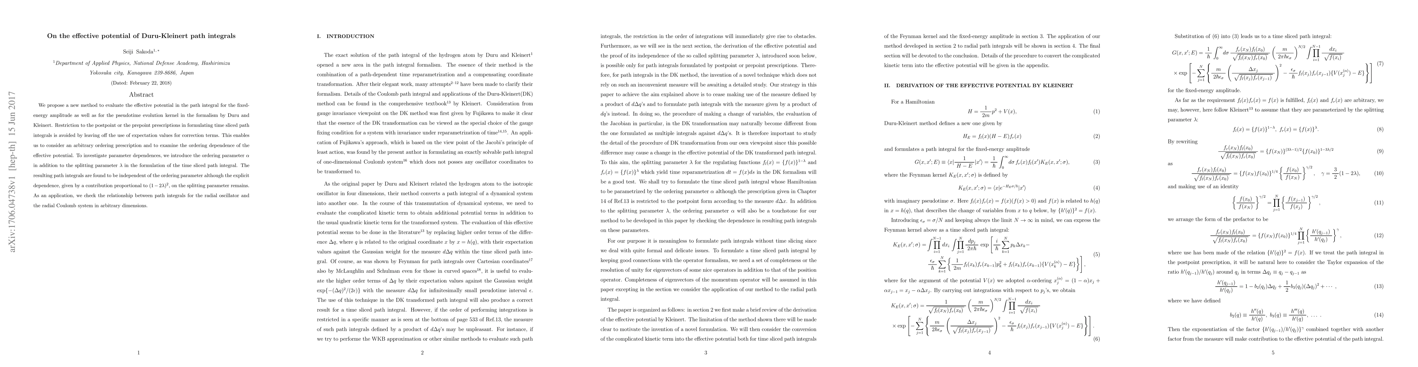 We propose a new method to evaluate the effective potential in the path integral for the fixed-energy amplitude as well as for the pseudotime evolution kernel in the formalism by Duru and Kleinert. Restriction to the postpoint or the prepoint prescriptions in formulating time sliced path integrals is avoided by leaving off the use of expectation values for correction terms. This enables us to consider an arbitrary ordering prescription and to examine the ordering dependence of the effective potential. To investigate parameter dependences, we introduce the ordering parameter $\alpha$ in addition to the splitting parameter $\lambda$ in the formulation of the time sliced path integral. The resulting path integrals are found to be independent of the ordering parameter although the explicit dependence, given by a contribution proportional to $(1-2\lambda)^{2}$, on the splitting parameter remains. As an application, we check the relationship between path integrals for the radial oscillator and the radial Coulomb system in arbitrary dimensions.