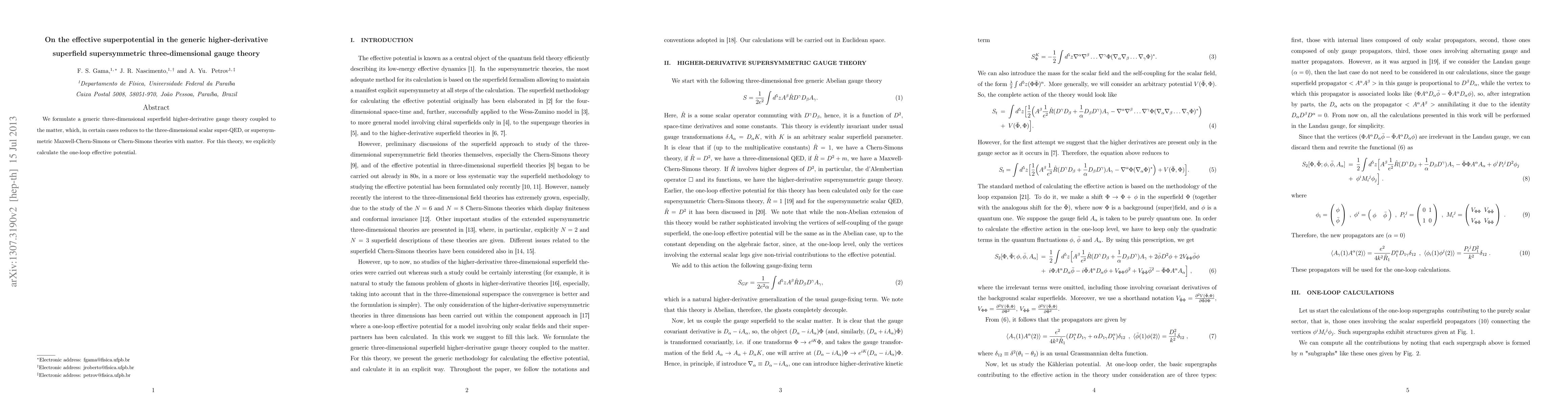 This paper formulates a generic three-dimensional superfield higher-derivative gauge theory coupled to matter, reducing to known supersymmetric theories. It calculates the one-loop effective potential for this theory.