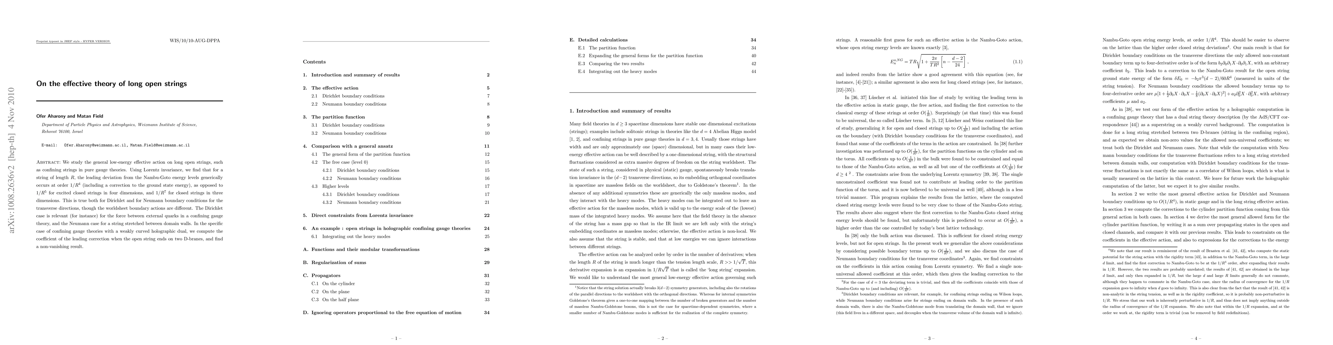 We study the general low-energy effective action on long open strings, such as confining strings in pure gauge theories. Using Lorentz invariance, we find that for a string of length R, the leading deviation from the Nambu-Goto energy levels generically occurs at order 1/R^4 (including a correction to the ground state energy), as opposed to 1/R^5 for excited closed strings in four dimensions, and 1/R^7 for closed strings in three dimensions. This is true both for Dirichlet and for Neumann boundary conditions for the transverse directions, though the worldsheet boundary actions are different. The Dirichlet case is relevant (for instance) for the force between external quarks in a confining gauge theory, and the Neumann case for a string stretched between domain walls. In the specific case of confining gauge theories with a weakly curved holographic dual, we compute the coefficient of the leading correction when the open string ends on two D-branes, and find a non-vanishing result.