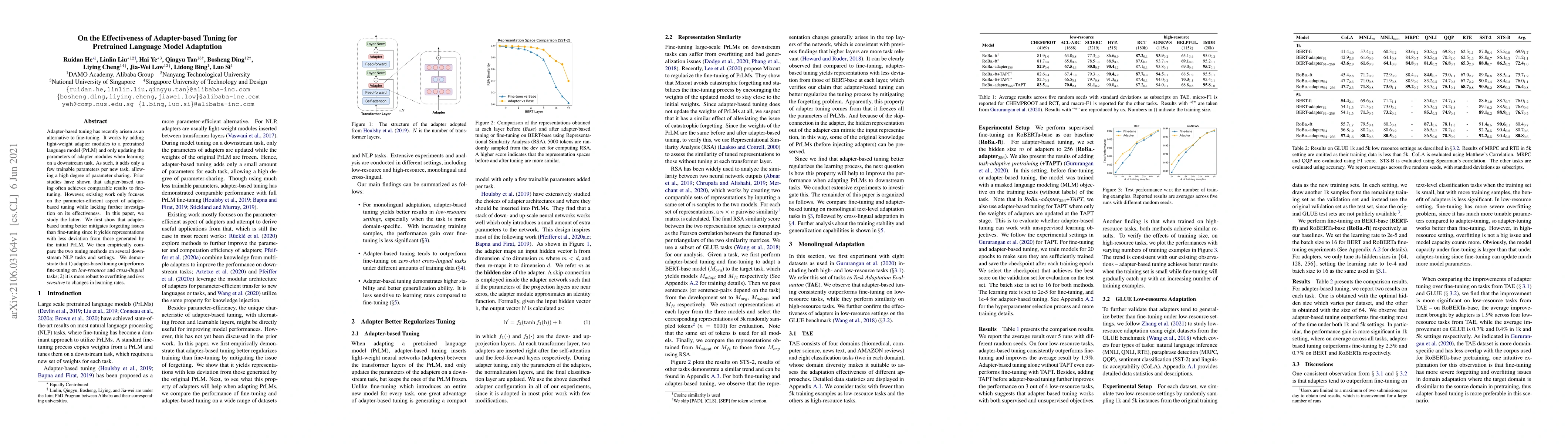 This paper investigates the effectiveness of adapter-based tuning compared to fine-tuning for pretrained language models, showing that it mitigates forgetting better and outperforms fine-tuning on low-resource and cross-lingual tasks, while also being more robust to overfitting.