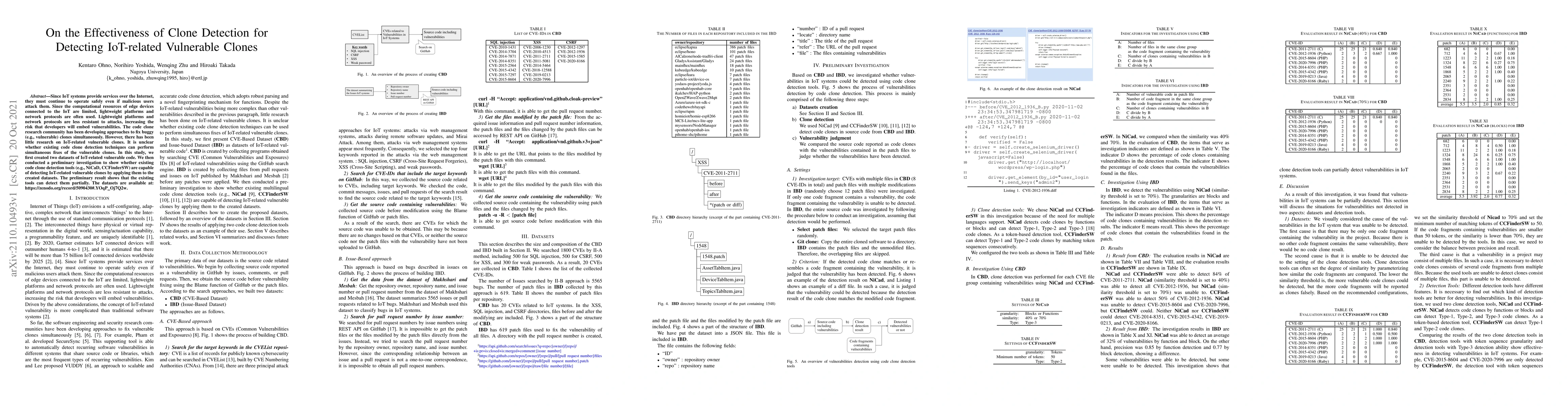 Since IoT systems provide services over the Internet, they must continue to operate safely even if malicious users attack them. Since the computational resources of edge devices connected to the IoT are limited, lightweight platforms and network protocols are often used. Lightweight platforms and network protocols are less resistant to attacks, increasing the risk that developers will embed vulnerabilities. The code clone research community has been developing approaches to fix buggy (e.g., vulnerable) clones simultaneously. However, there has been little research on IoT-related vulnerable clones. It is unclear whether existing code clone detection techniques can perform simultaneous fixes of the vulnerable clones. In this study, we first created two datasets of IoT-related vulnerable code. We then conducted a preliminary investigation to show whether existing code clone detection tools (e.g., NiCaD, CCFinderSW) are capable of detecting IoT-related vulnerable clones by applying them to the created datasets. The preliminary result shows that the existing tools can detect them partially.