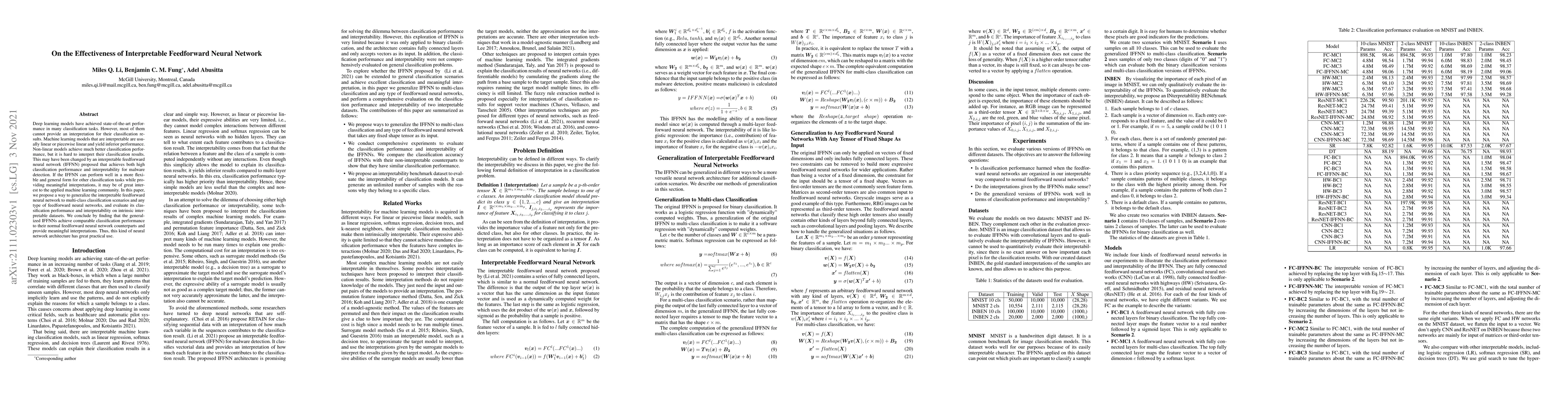 This paper proposes a generalized interpretable feedforward neural network (IFFNN) that achieves high classification performance and interpretability for multi-class scenarios. The results show that the IFFNNs perform comparably to traditional feedforward neural networks while offering meaningful interpretations, indicating their practical utility.
