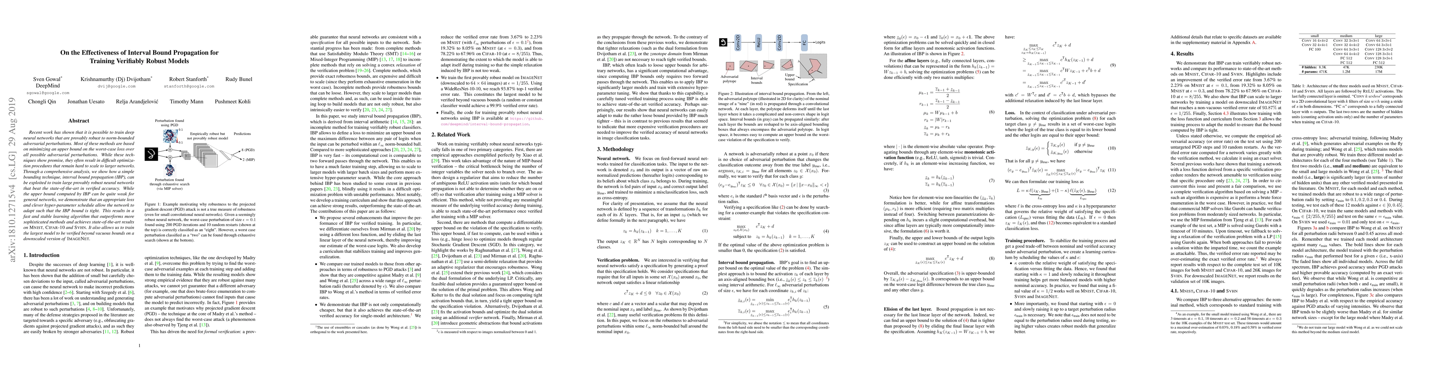 This paper demonstrates that interval bound propagation (IBP) can effectively train large, provably robust neural networks, achieving state-of-the-art verified accuracy on datasets like MNIST, CIFAR-10, and SVHN, while outperforming more complex methods through a fast and stable learning algorithm.
